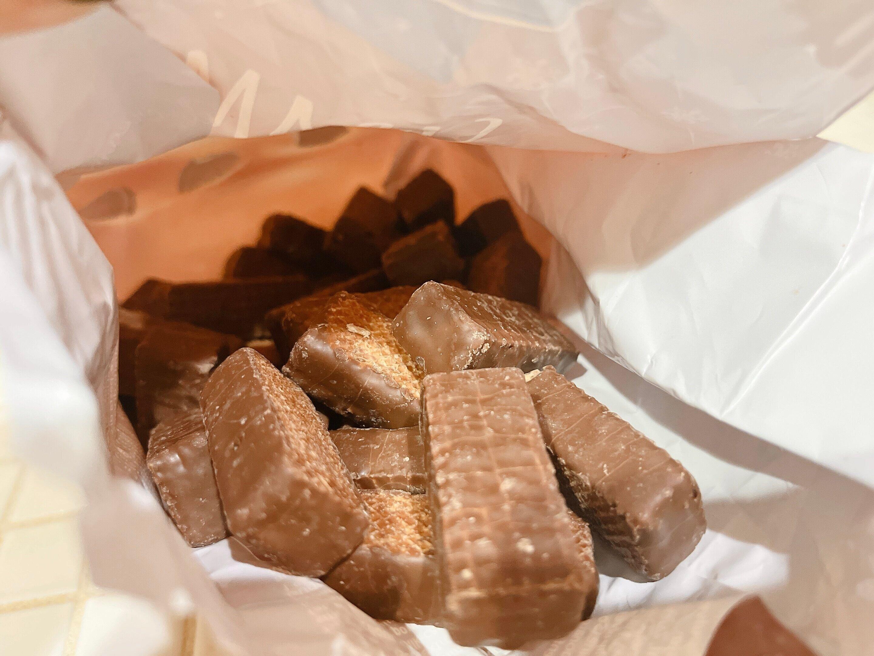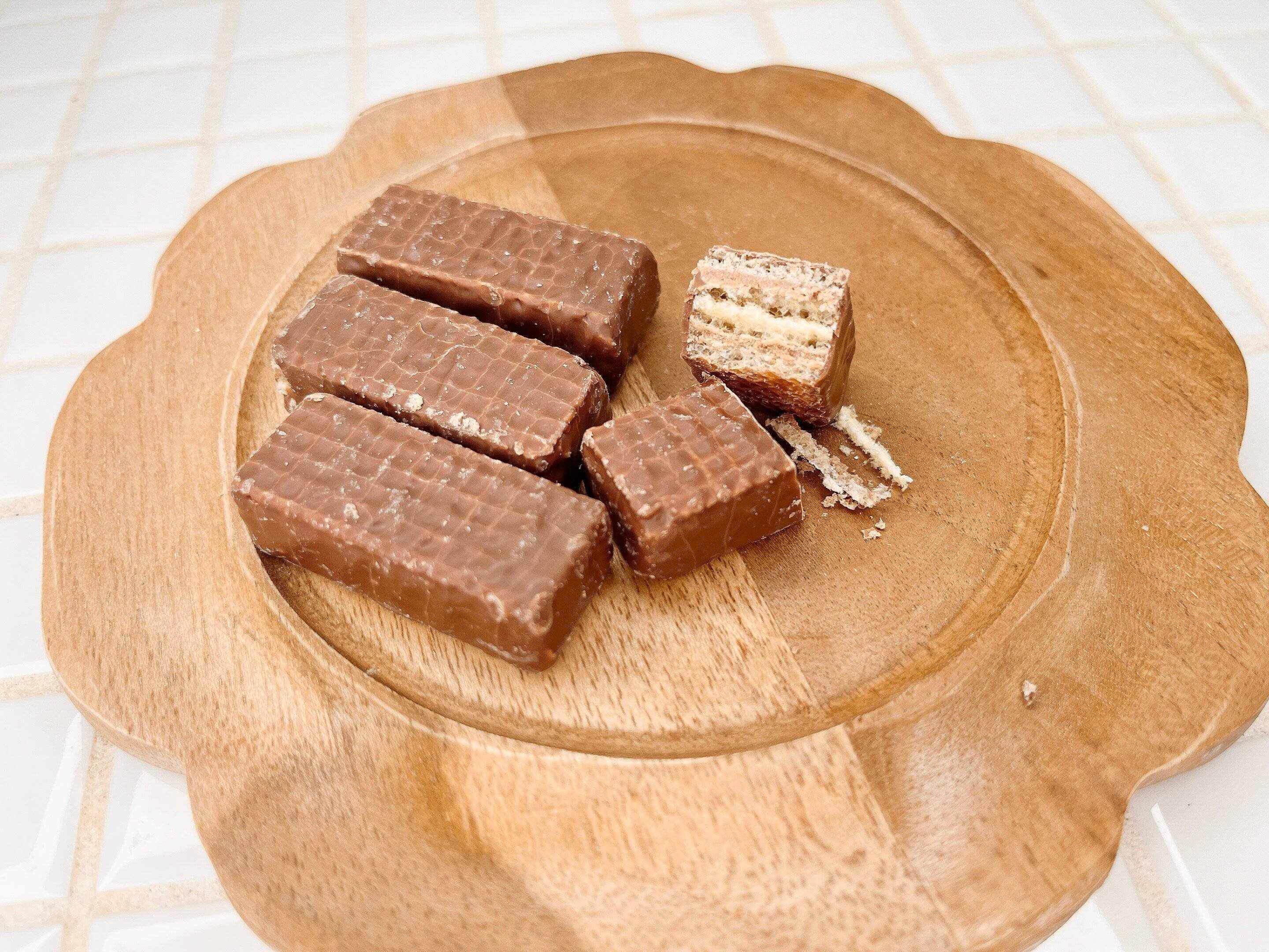 一口サイズのサクサクのウエハースに、チョコレートでコーティングされている商品です。