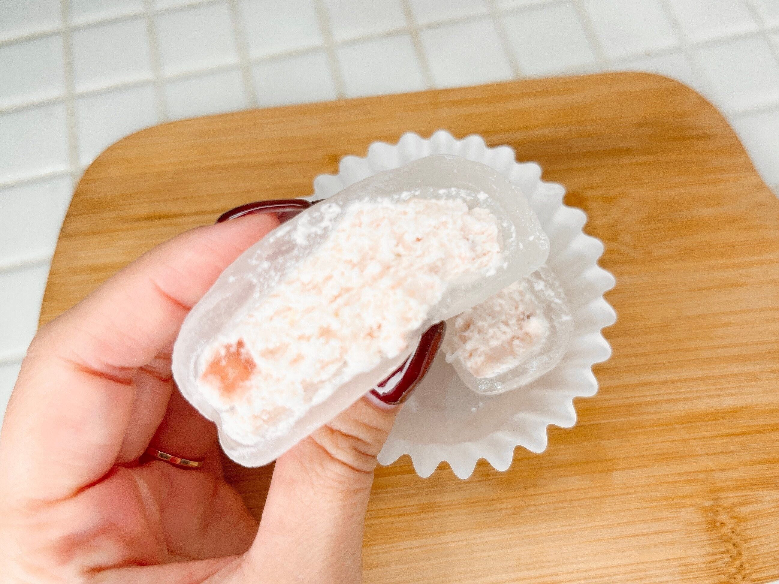 冷凍庫から冷蔵庫へうつし、2時間後に開封。半分にカットしましたが、わらび餅は柔らかくてぷるぷる、中には薄ピンク色のいちごのクリームがたっぷり入っています。