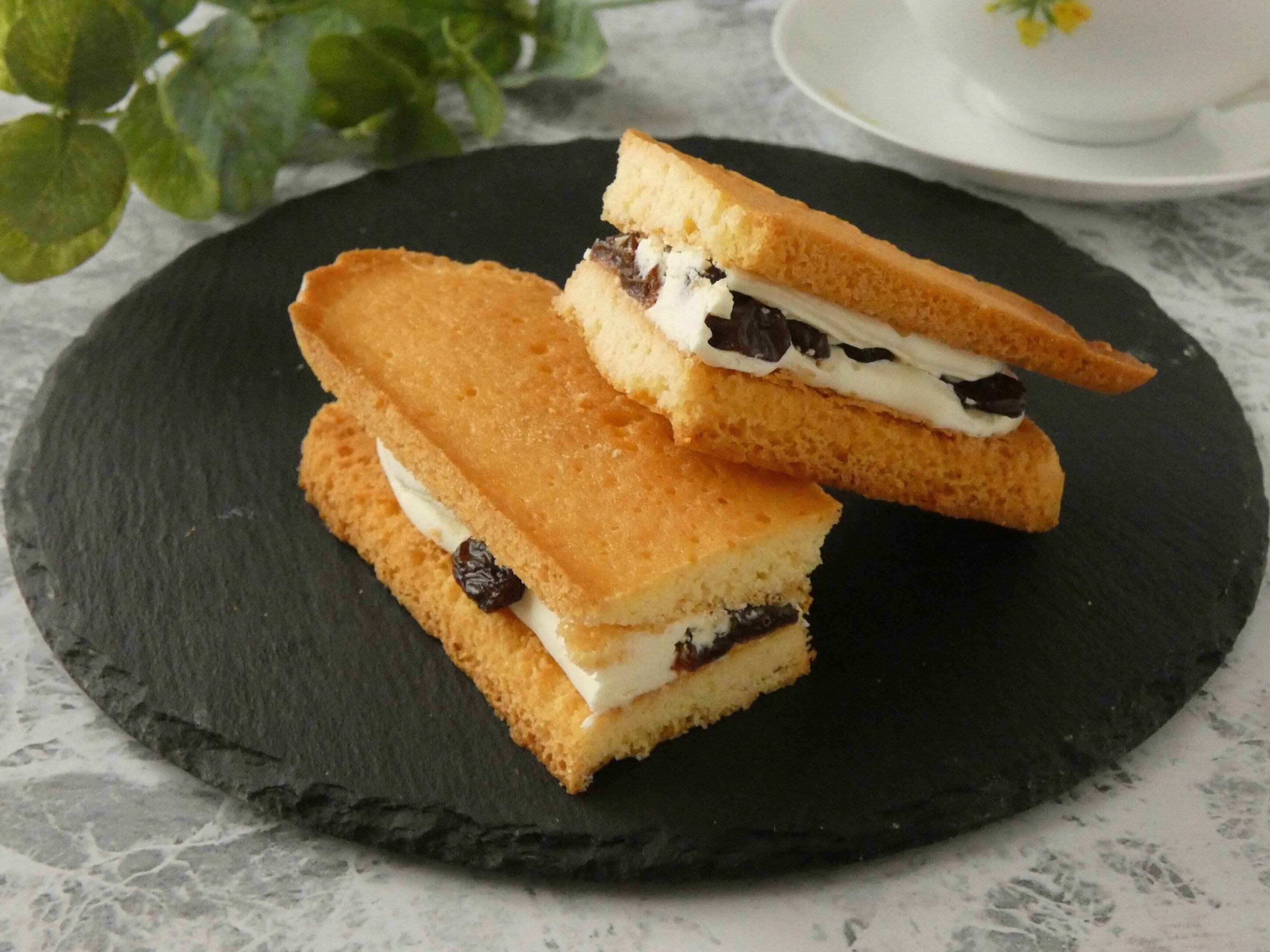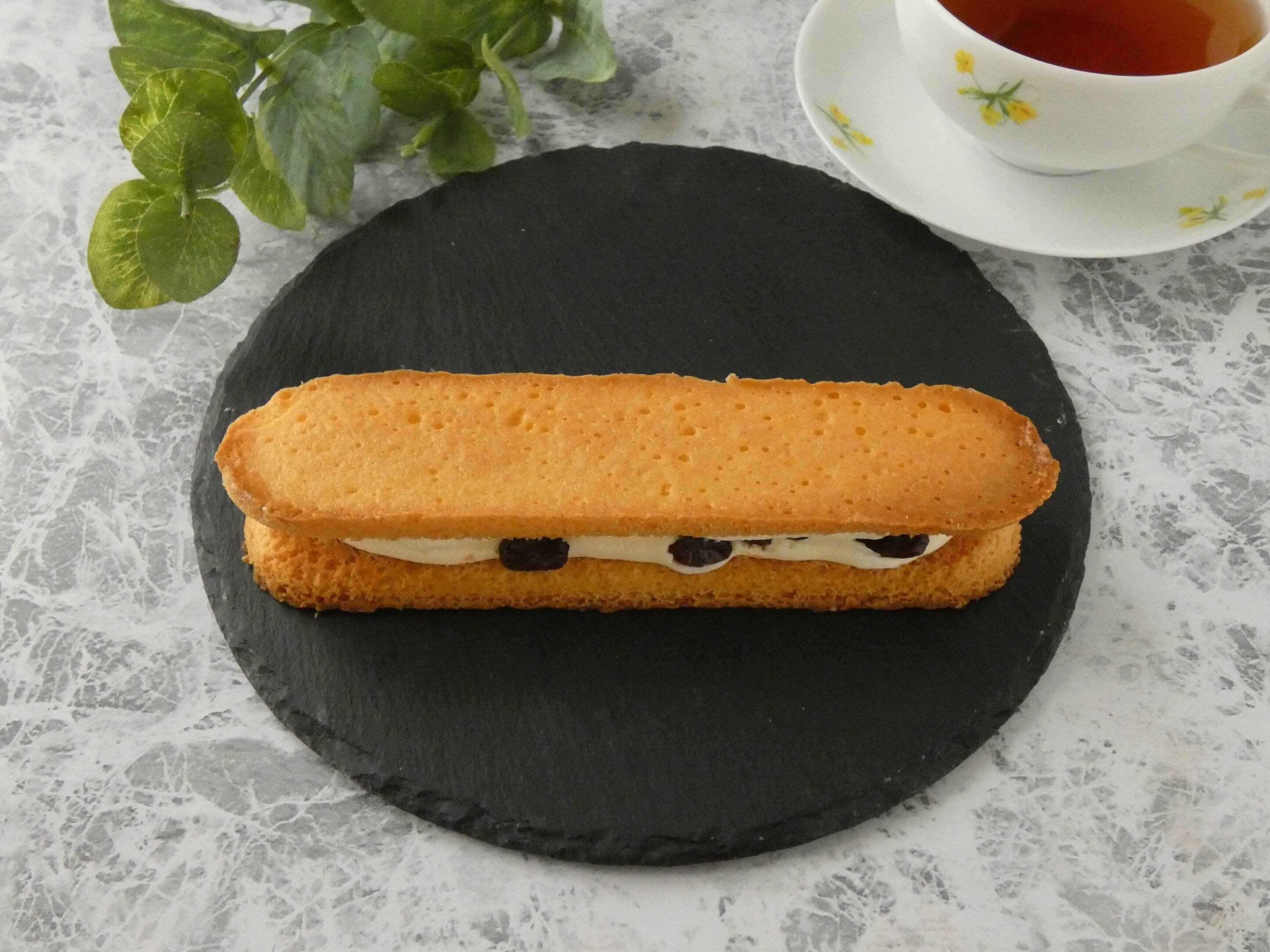 細長い形のクッキーにミルク風味のクリ-ムとラムレーズンが挟んであります。