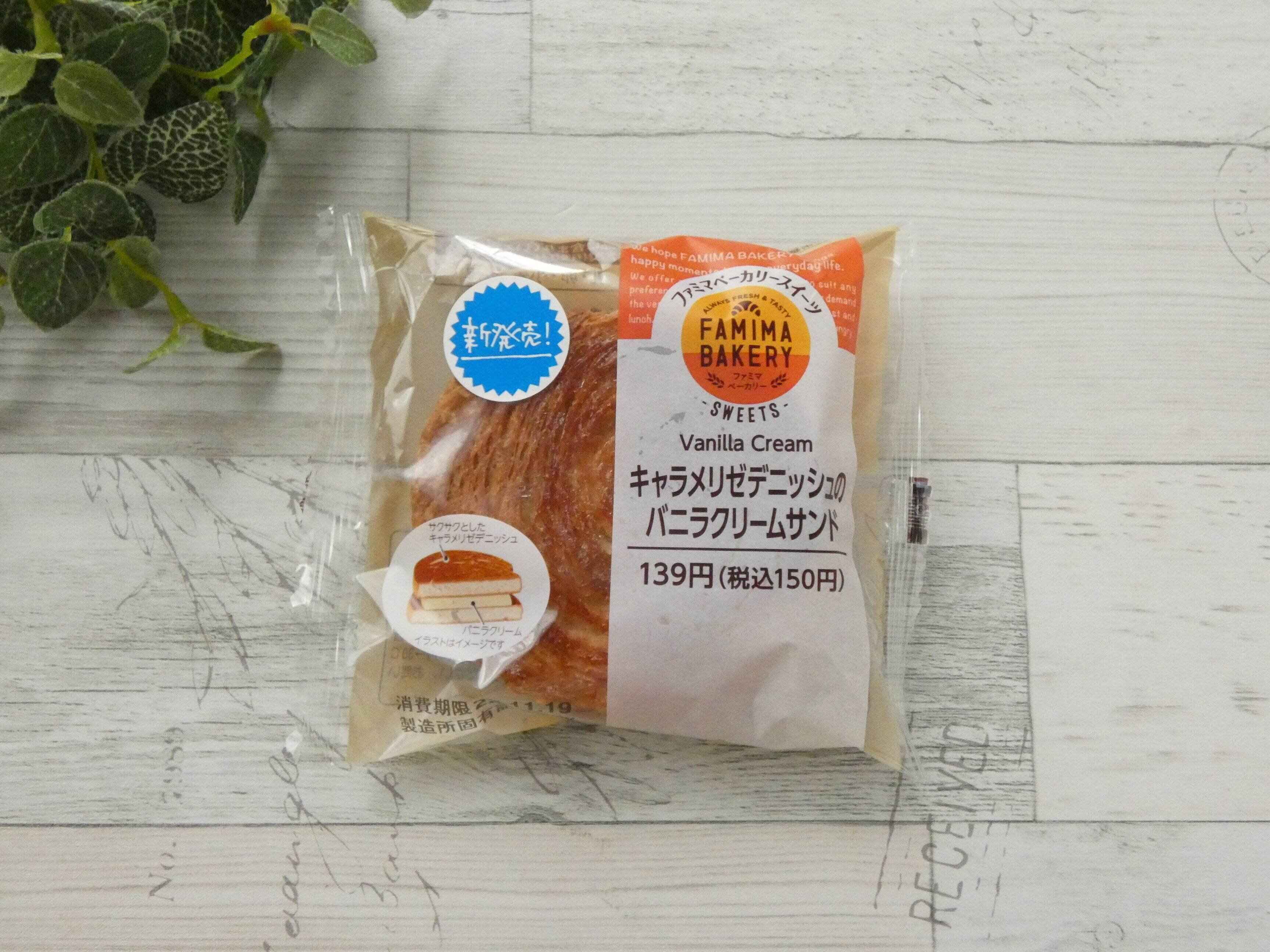 ファミリーマート新発売「キャラメリゼデニッシュのバニラクリームサンド」は150円。
