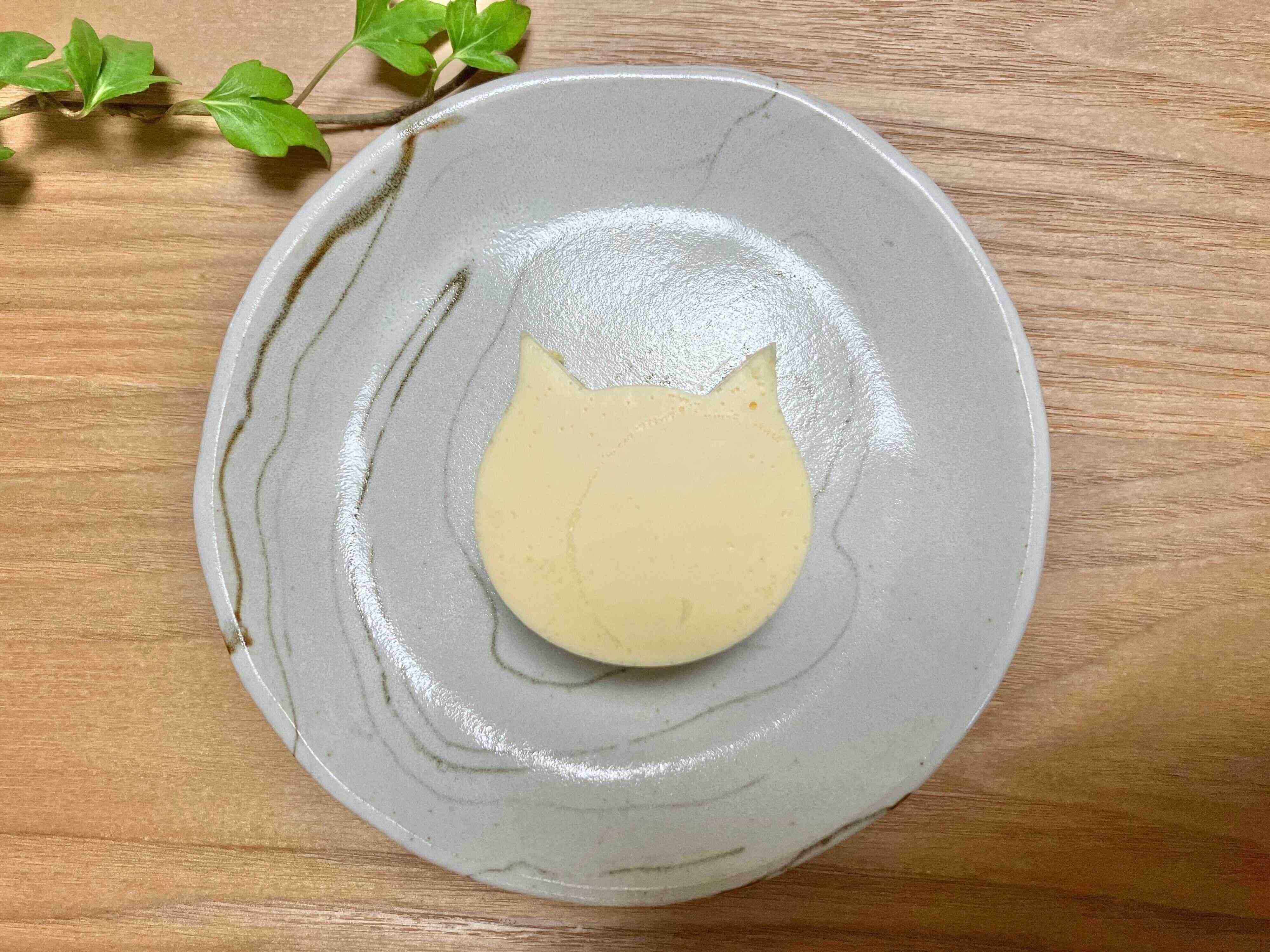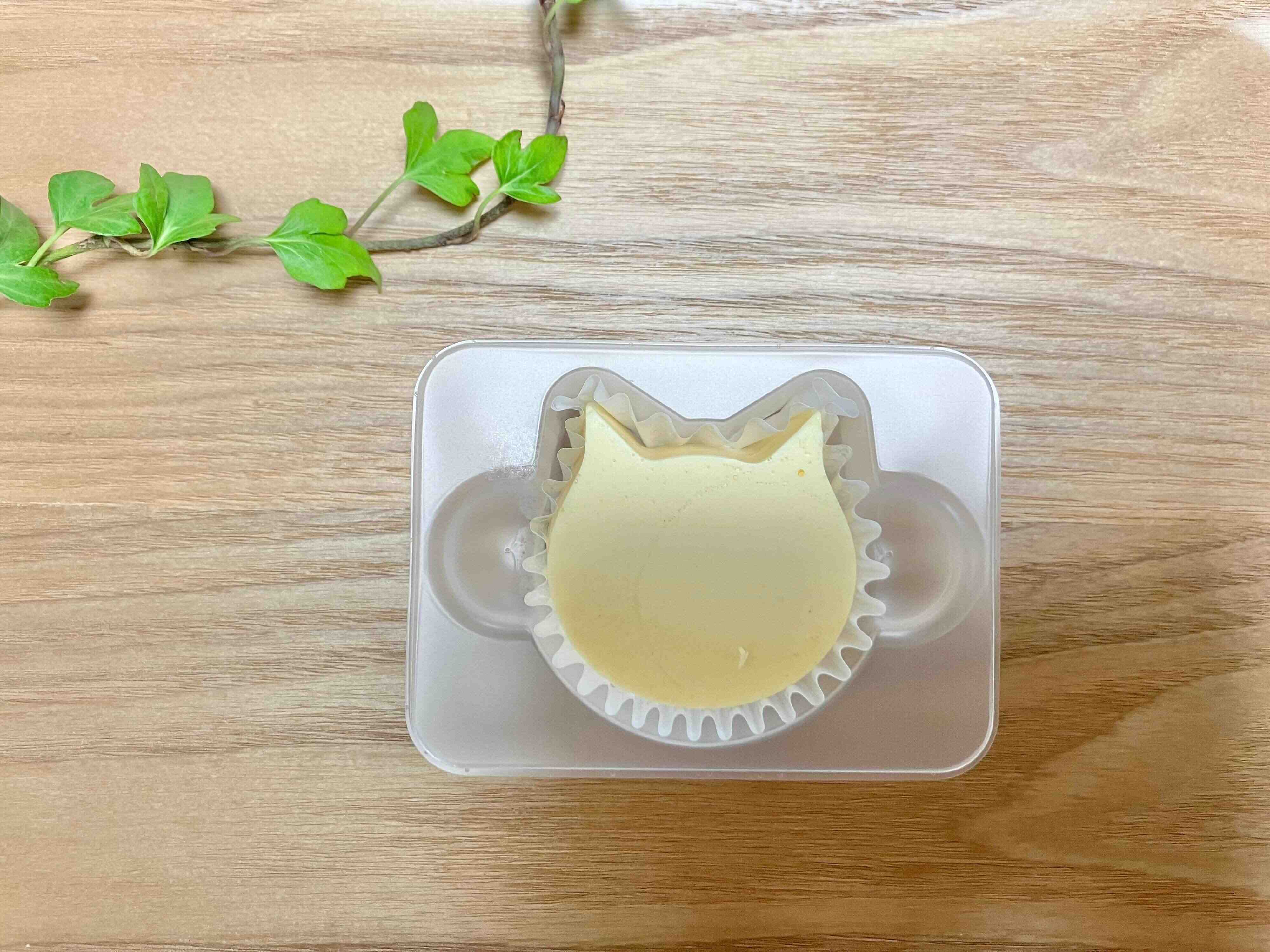 開封するとかわいらしい猫の形をしたチーズケーキが出てきました。猫の形が崩れないようにトレーに入っています。