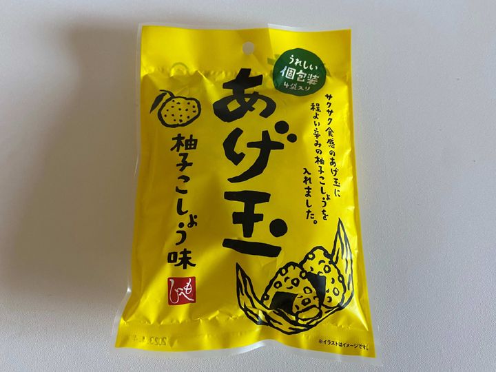 カルディで見つけた「あげ玉柚子こしょう味」(購入時:128円)。黄色いパッケージが存在感がありついつい手にとってしまった商品。