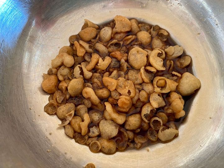 あげ玉にめんつゆをかけて数分浸しておきます。