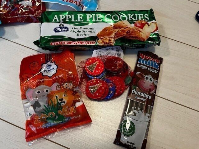かわいらしいクリスマスのデザインのソックスに、なんとお菓子が沢山入っているのです。