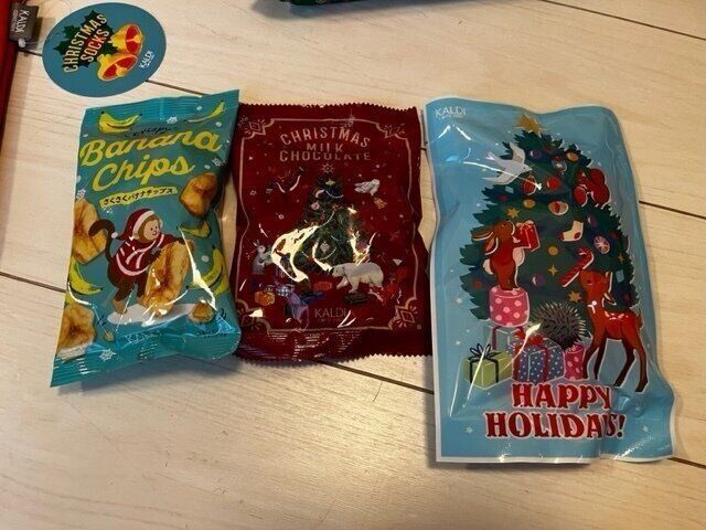 カルディでも大人気のバナナチップスがクリスマスパッケージになっています。