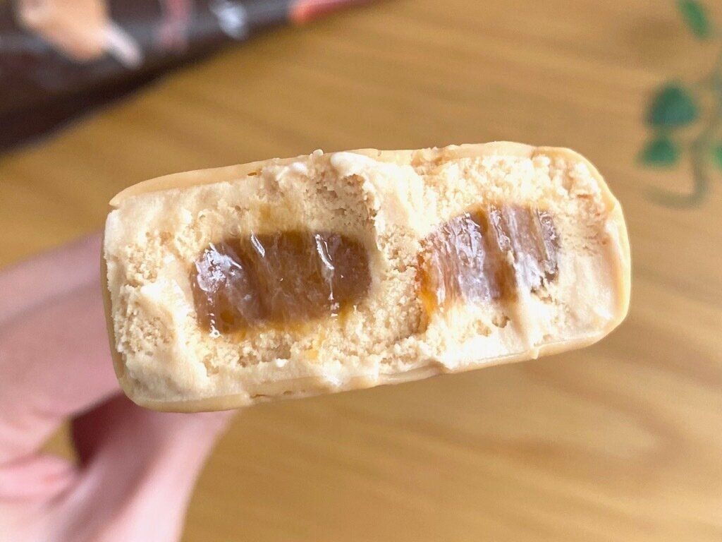 外側のキャラメルコーティングは薄くコーティングされているのでパリパリッと至福の食感。口どけがよく、キャラメルアイスと自然になじんでいきます。