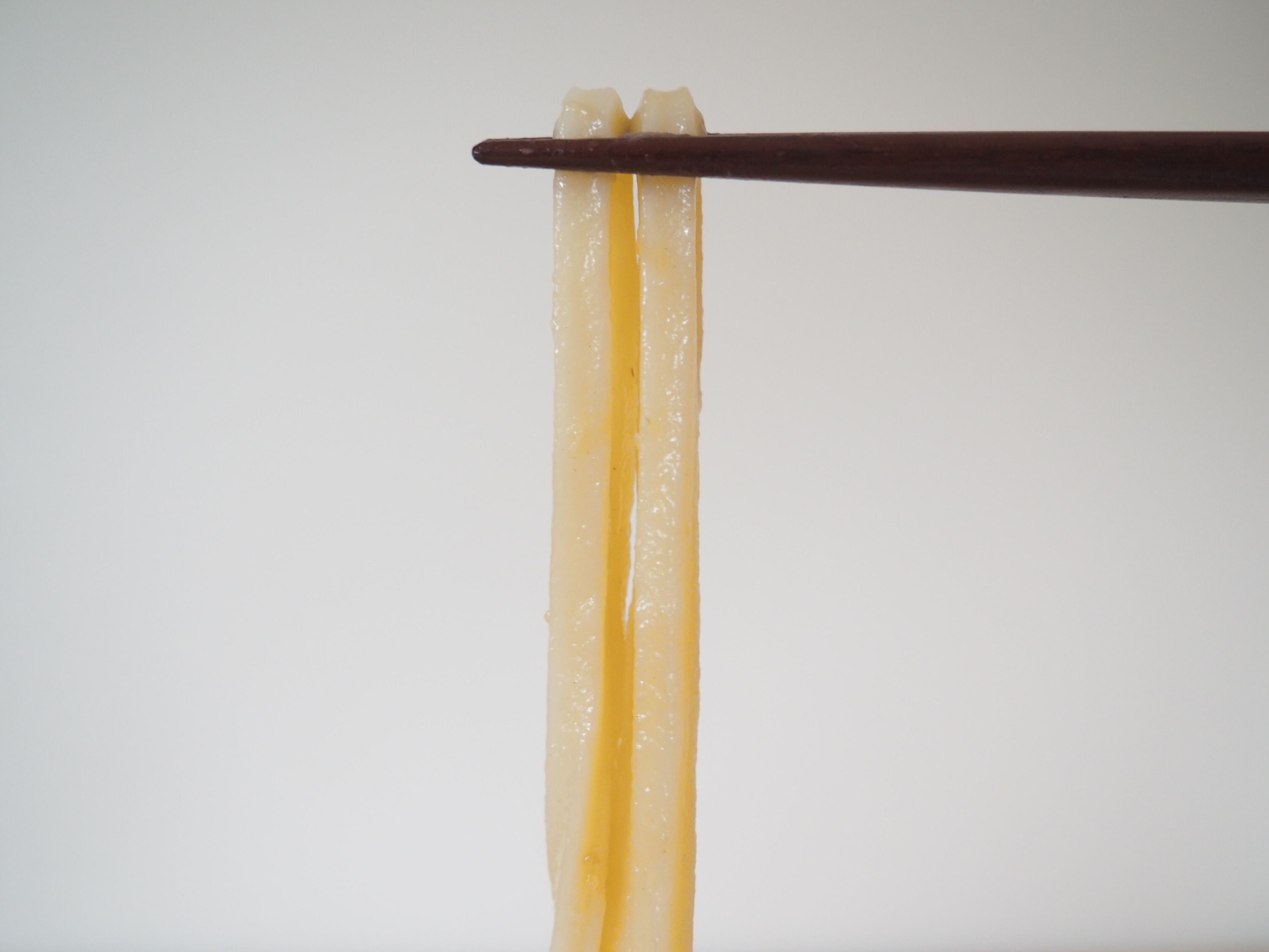 では食レポお届けします。うどんは太く、箸で持つとしっかりとした重みを感じます。つるっとしたのど越しと、しっかりとコシがあり、食べ応えも十分!