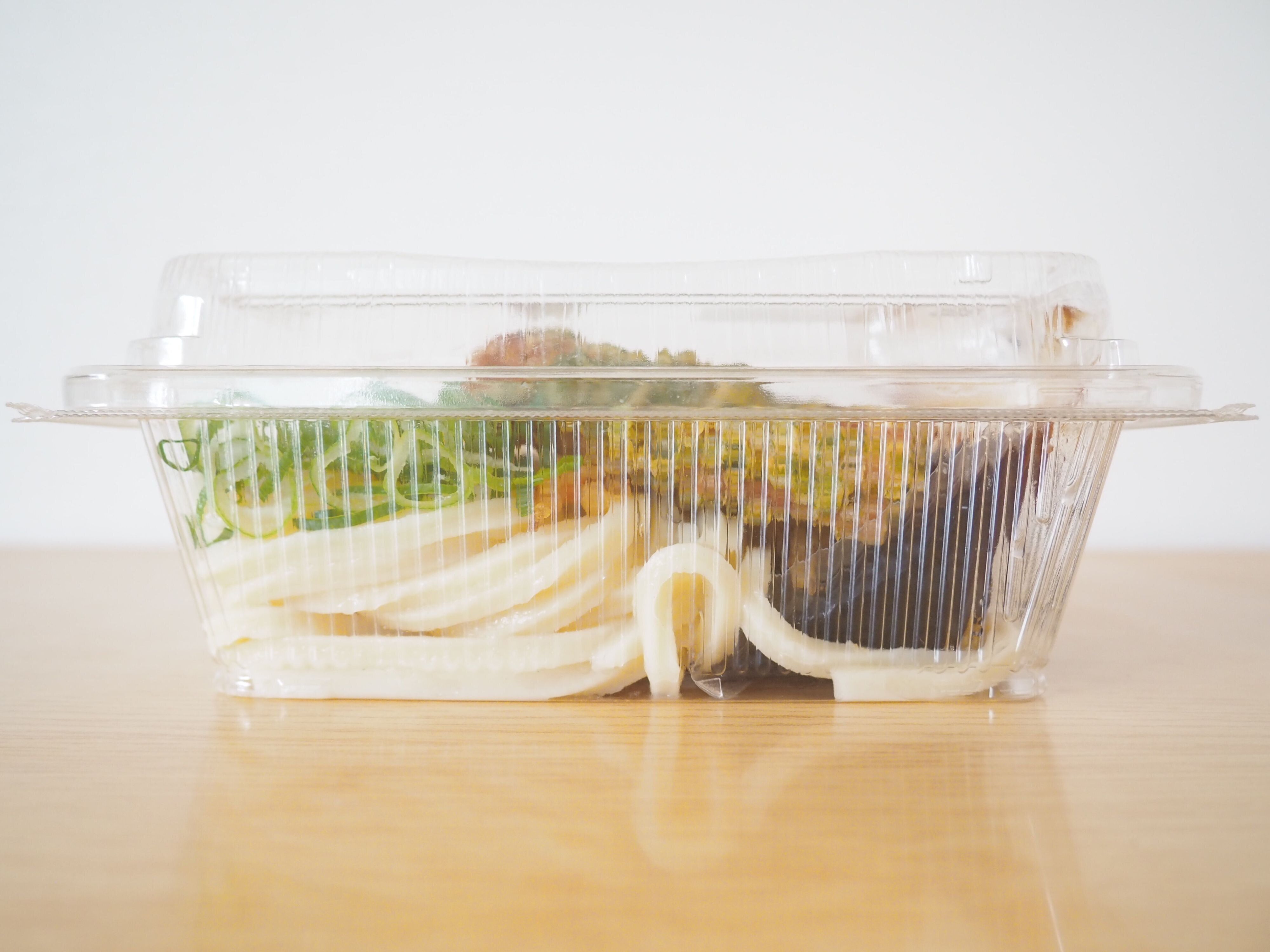 そして購入したものがこちらです。「ぶっかけ冷」「かけ温」の2種類があり、今回は「ぶっかけ冷」を購入。四角いプラスチックの容器に入っているのが、いかにもお弁当という感じがしませんか?