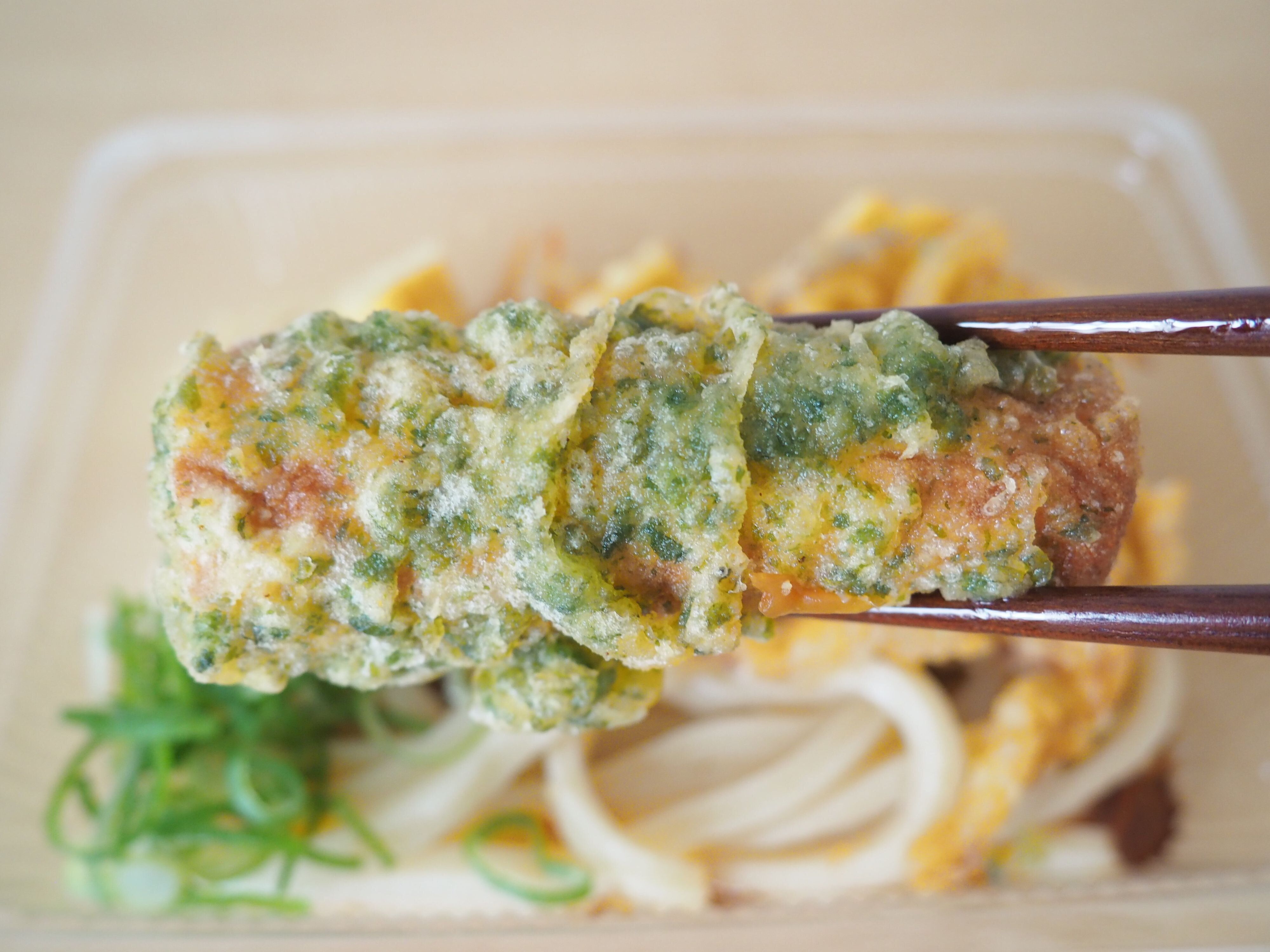 ちくわ磯辺天は海苔の香りがしっかり!ちくわ磯辺天、野菜バラ天共に衣が薄く、少し時間が経ってもサクッとした歯触りを楽しめます。この揚げ物の油がつゆにしみるとコクが出て、ますますうどんがおいしくなる…!