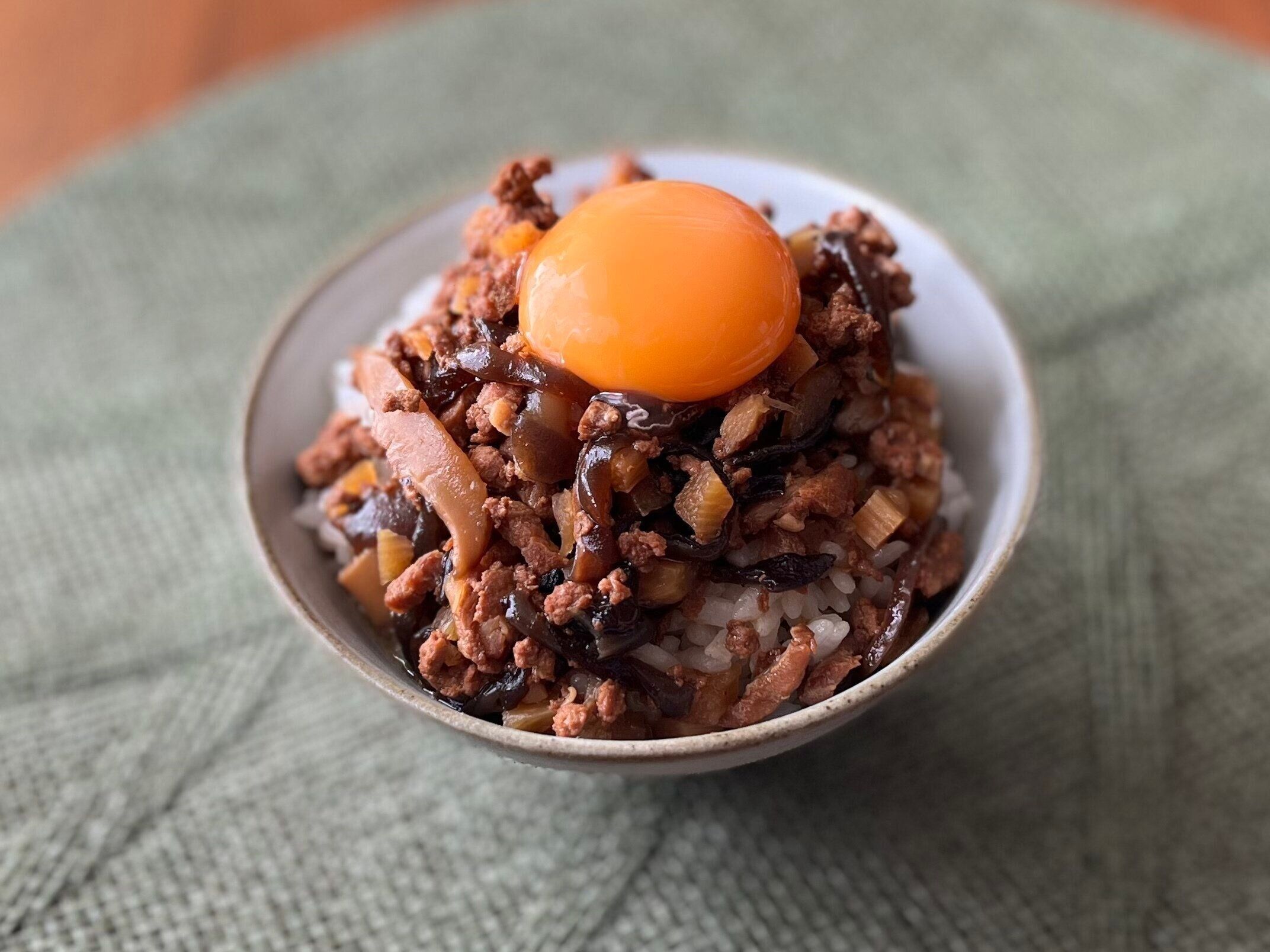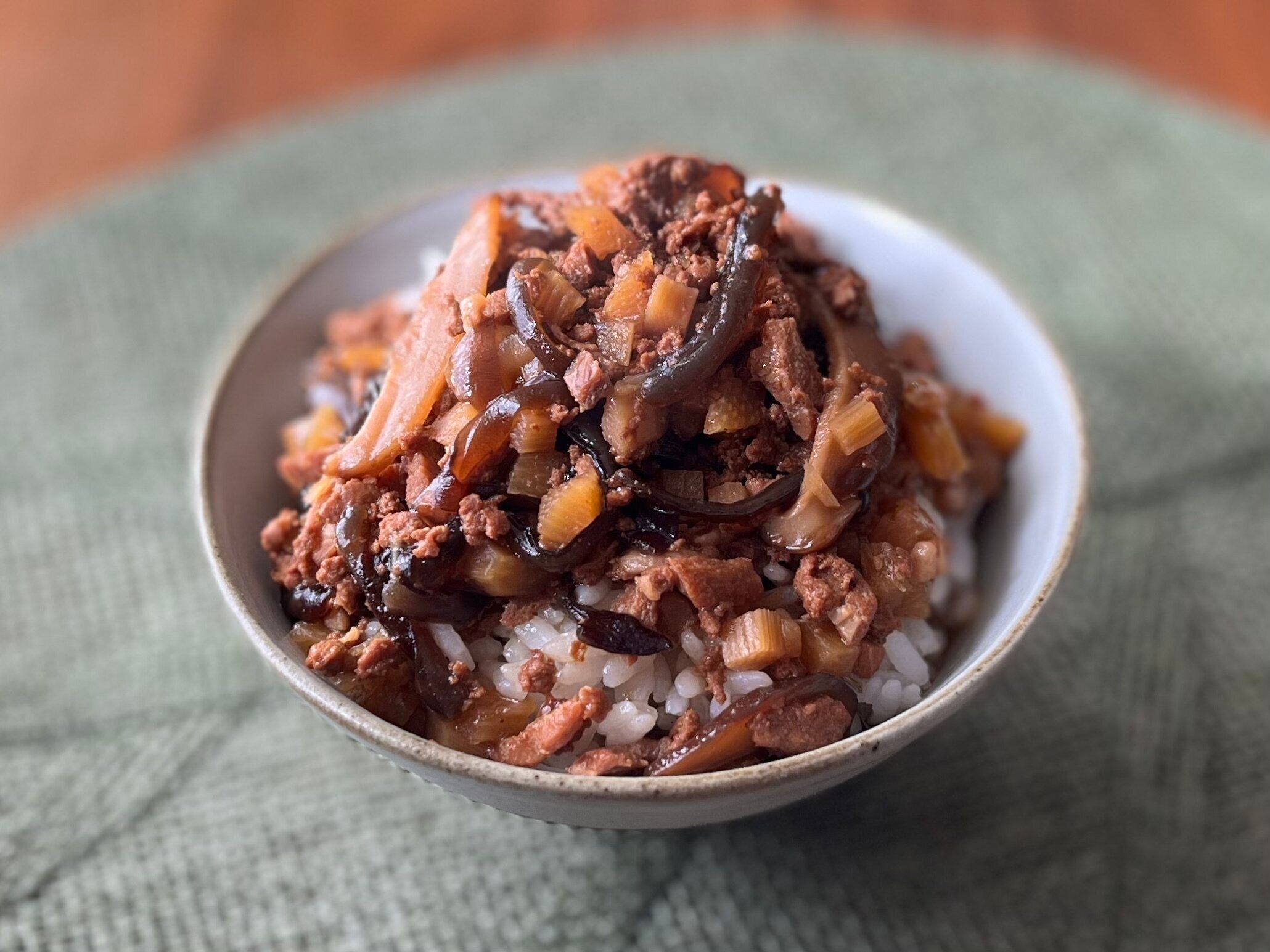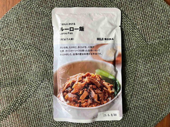 「ルーロー飯」とは、甘辛く煮込んだ豚肉をごはんにかけた台湾の屋台料理のこと。現地では豚バラ肉が使用されることが多いですが、無印良品のルーロー飯は豚ひき肉を使用。これにたけのこやきくらげ、椎茸を合わせて甘辛いタレで煮込んでいます。