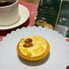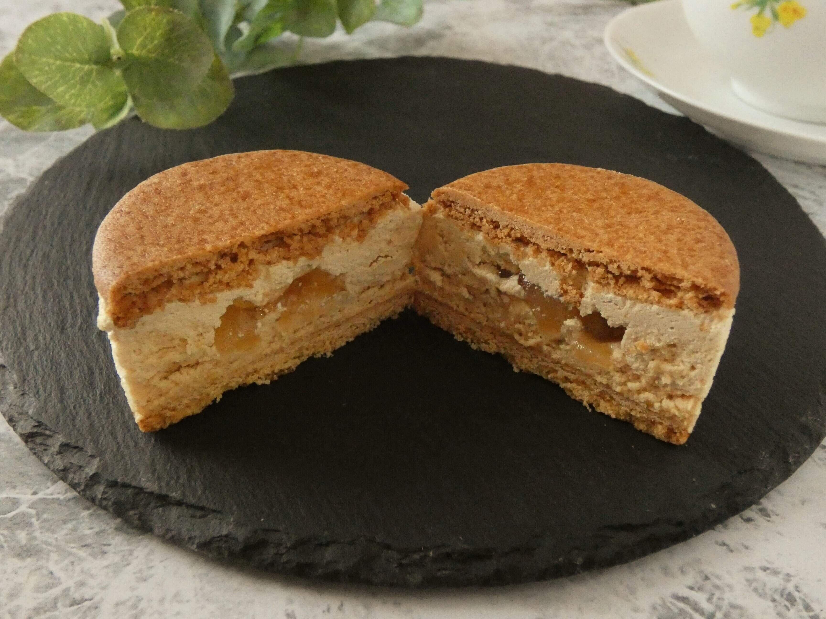 手のひらサイズのスイーツで、こんがりと焼いたビスケットにキャラメルチーズクリームがたっぷり。クリーム中央には焼きりんごが入っています。