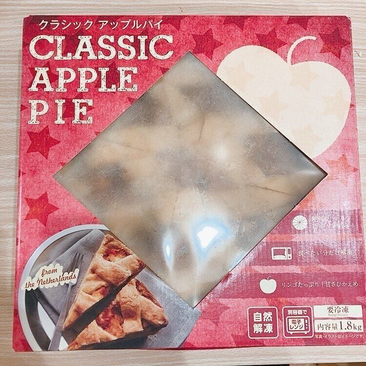業務スーパーの冷凍コーナーで、ドーンっと大きな箱で売られているのがオランダ産の「クラシックアップルパイ」。購入時価格1,380円(税抜)でした。内容量が1.8kgと書いてあるだけあって冷凍庫から持ち上げてかごに移す時も重量感が感じられました。存在感のある大きな箱と重みで中身がしっかりつまっているアップルパイであることが箱を持っただけで分かります。持ってきたお買い物バッグに入るか不安になるほどです。