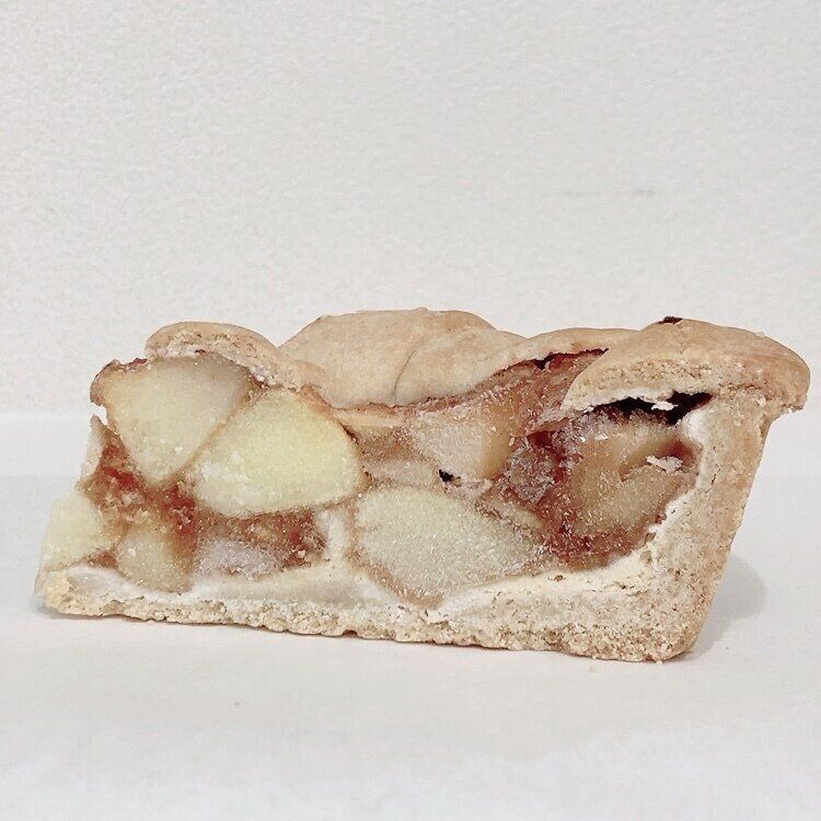 こちら箱を開けてまたびっくり!直径約25cmの巨大なアップルパイがギューっと詰まっています。冷凍ですが、シナモンのにおいと甘いパイ生地のにおいがフワっと漂いました。これは一気に食べられないな、どうやって保存しよう…と一瞬頭をよぎりました。でも大丈夫。こちらの商品はもうすでに12個にカットされています。わざわざ包丁とまな板をもってきてカットする手間がないのも魅力。