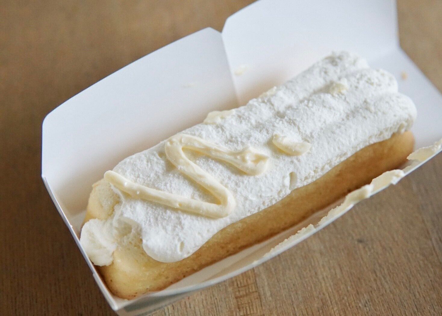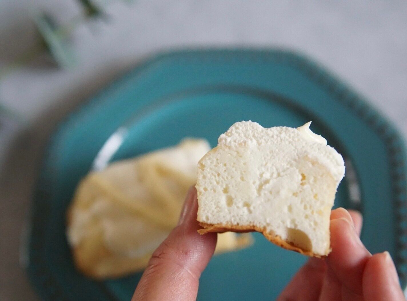 シフォンケーキと名前があるように、もっとふわっと軽いスポンジを予想していましたが、手に持ってみると意外とみっちりと詰まっている印象の生地でした。クリームもふわっというよりは固めで、上に乗っているだけではなく、中にもぎっしりと詰められています。生地とクリーム、両方の固さの差が少ない分、口に入った時の一体感が強く感じられ、クリームと生地のハーモニーみたいなものをしっかりと楽しむことができました。
