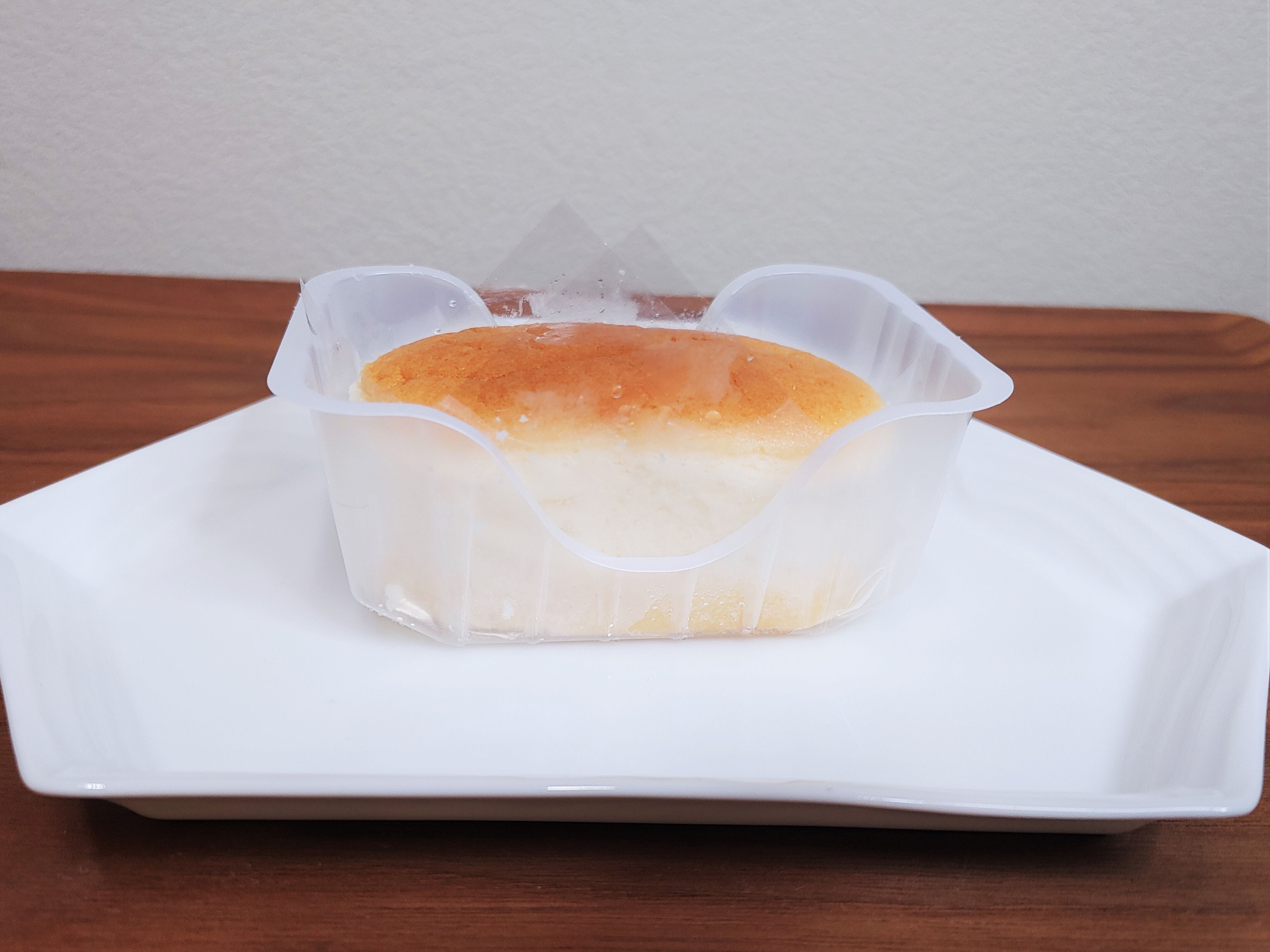 サイズは手のひらに収まる小ぶりな作り。底にスポンジ生地、その上にスフレチーズケーキという2層構造で至ってシンプルです。
