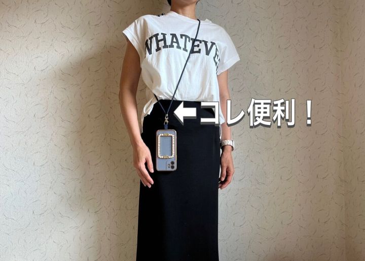 スマホに取り付ければ、肩掛けストラップとして使える便利アイテム。手ぶらでスマホを持ち歩けて落とす心配もありません。