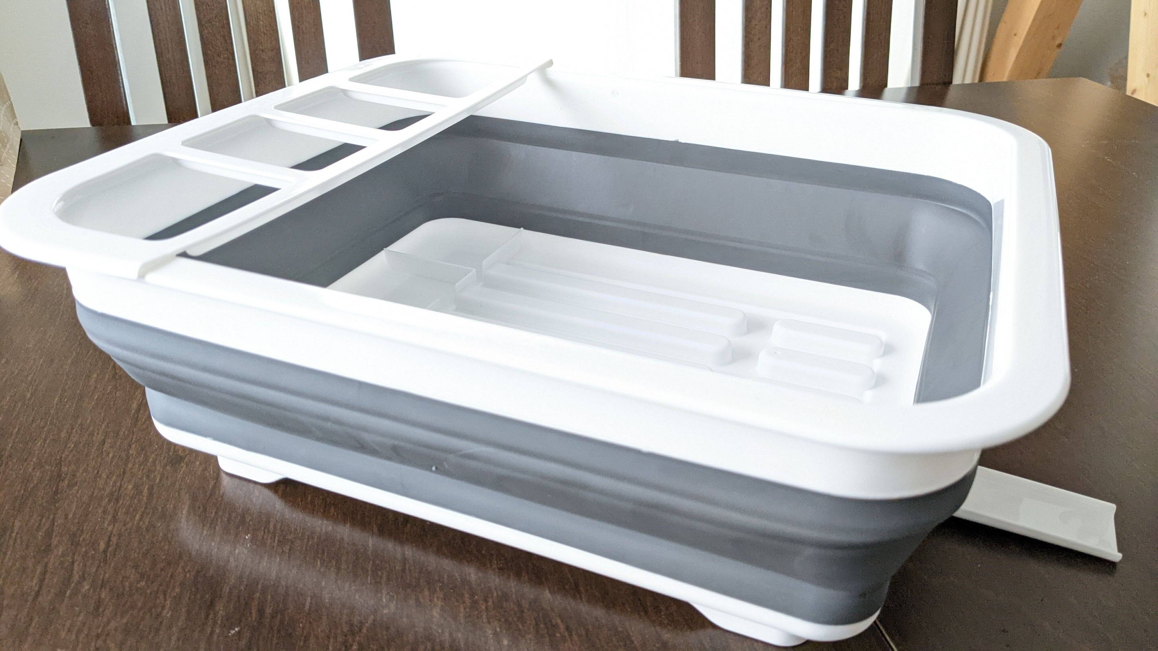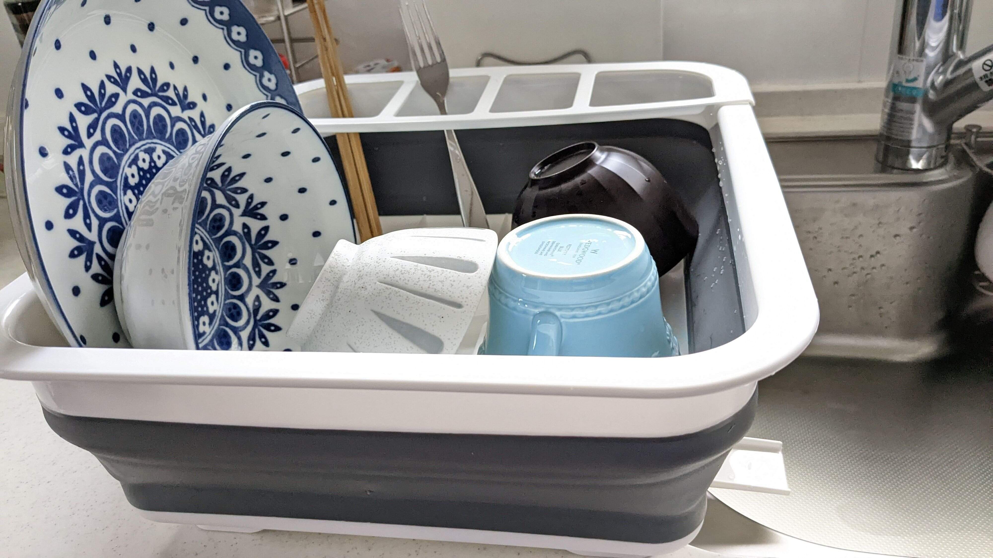 こちらの水切りバスケットを使うようになってからは、ある程度洗い物が溜まるまでは洗剤を入れた水につけ置き、時間があるときに軽くこすり洗いして流すだけ。おまけに散らからずにすっきり桶にまとまっているので、見た目もよく、食器洗いに対する気持ちがとても軽くなりました!