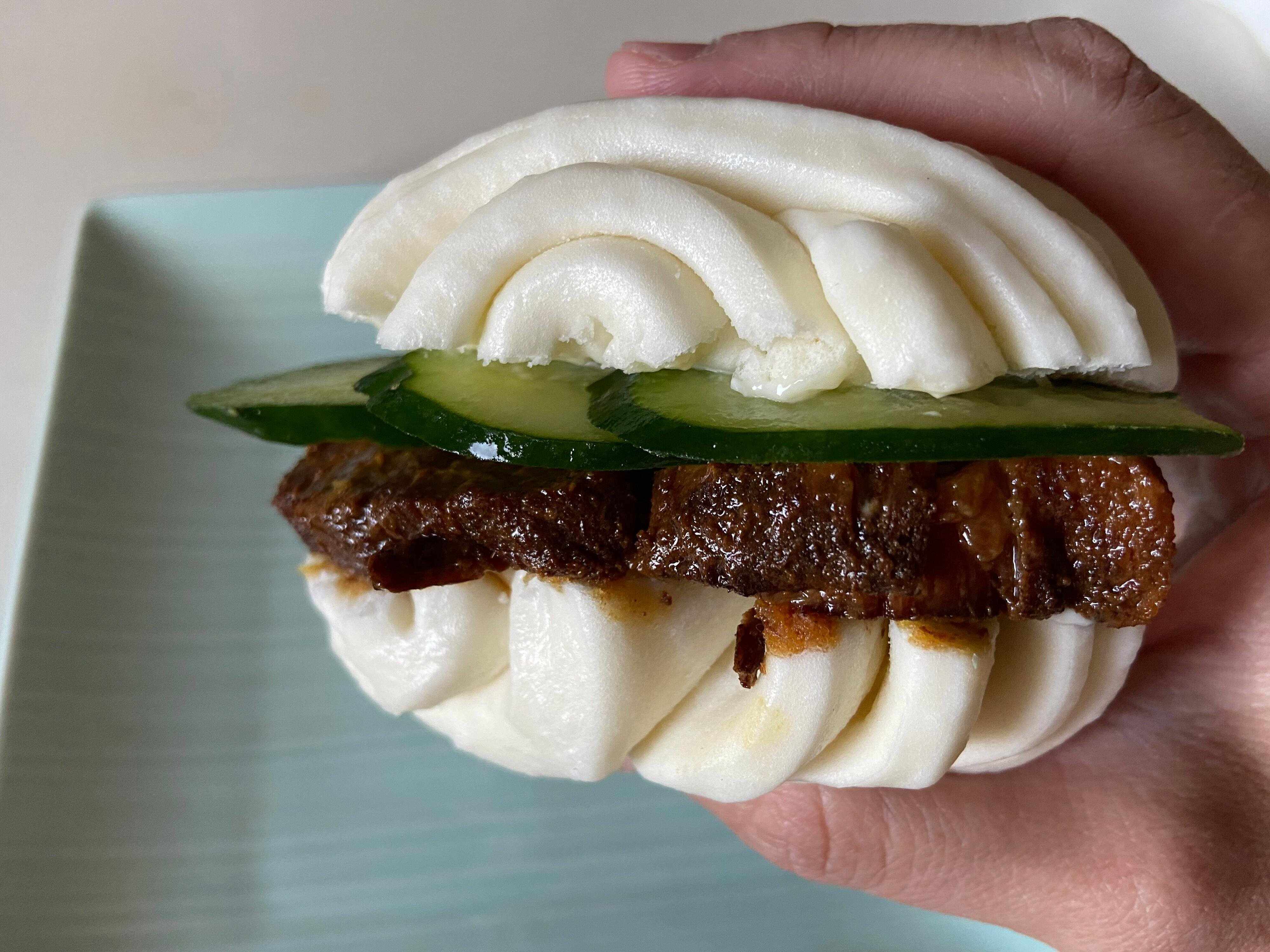 これが絶品!中華まんの皮のようなほんのり甘くてしっとりした花巻にチャーシューのタレが染みて、柔らかいお肉とシャキシャキきゅうりとのバランスが絶妙。