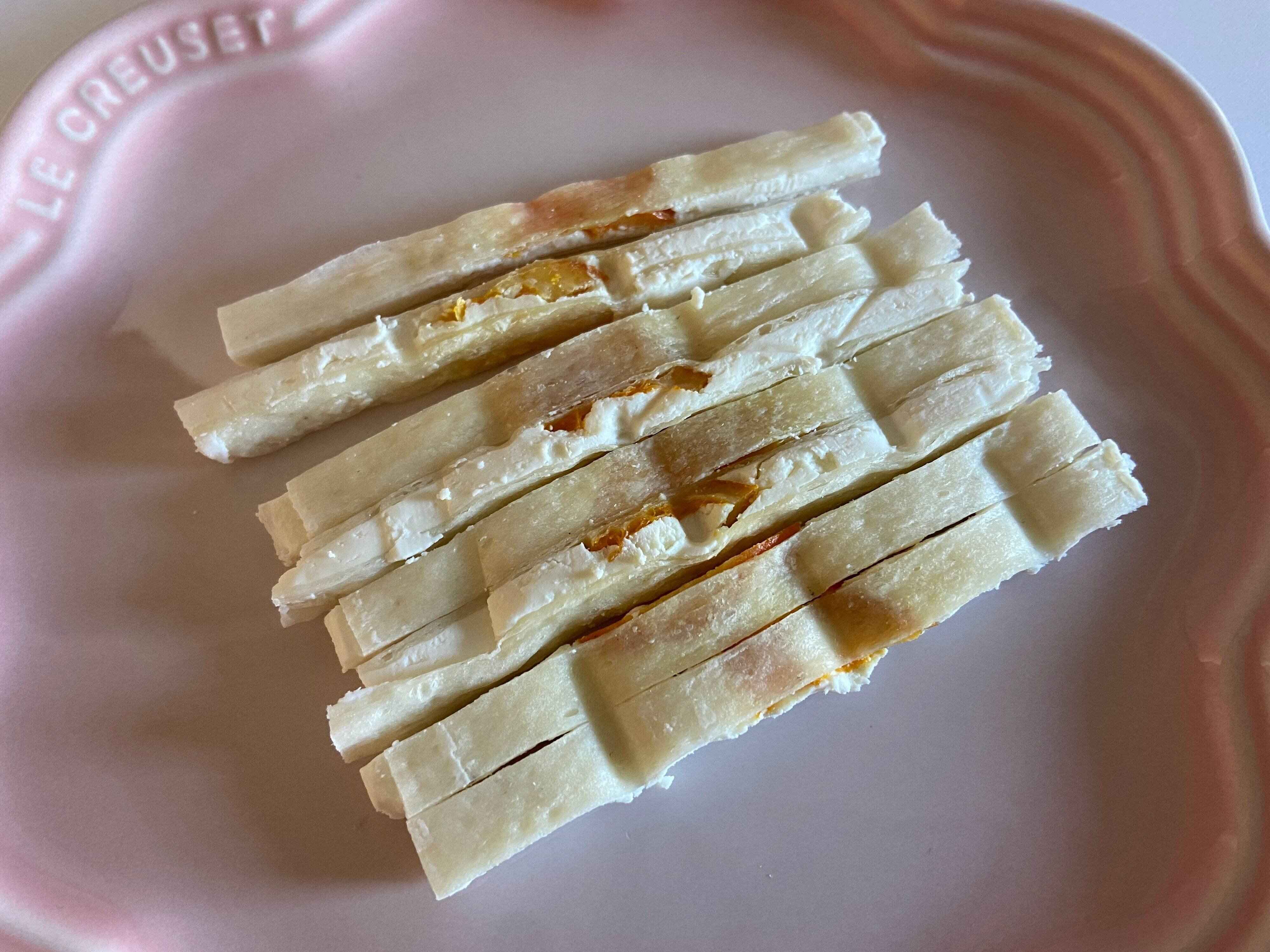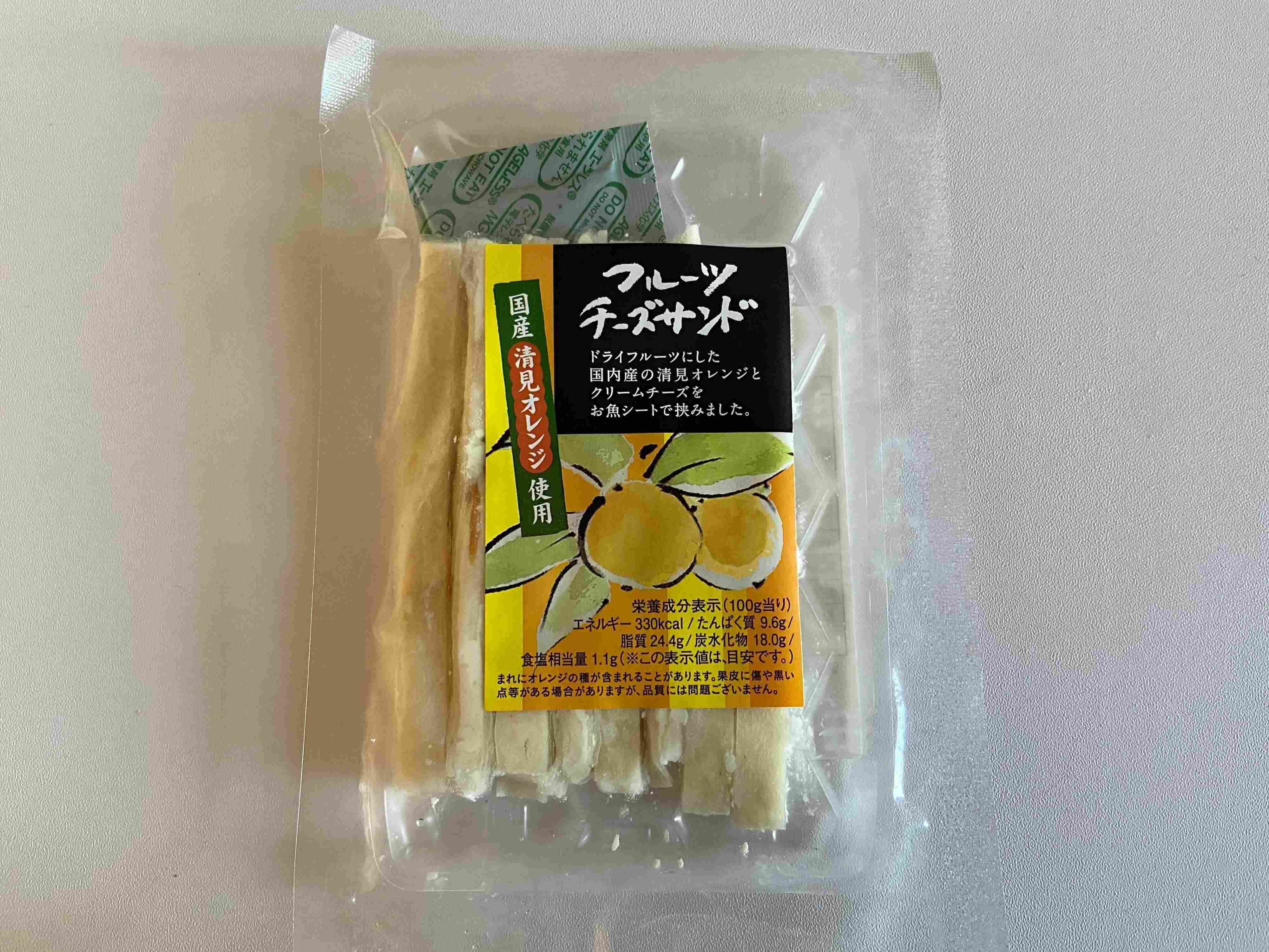 ドライフルーツにした国産清見オレンジとクリームチーズをお魚シートでサンドしたちょっと珍しい商品。