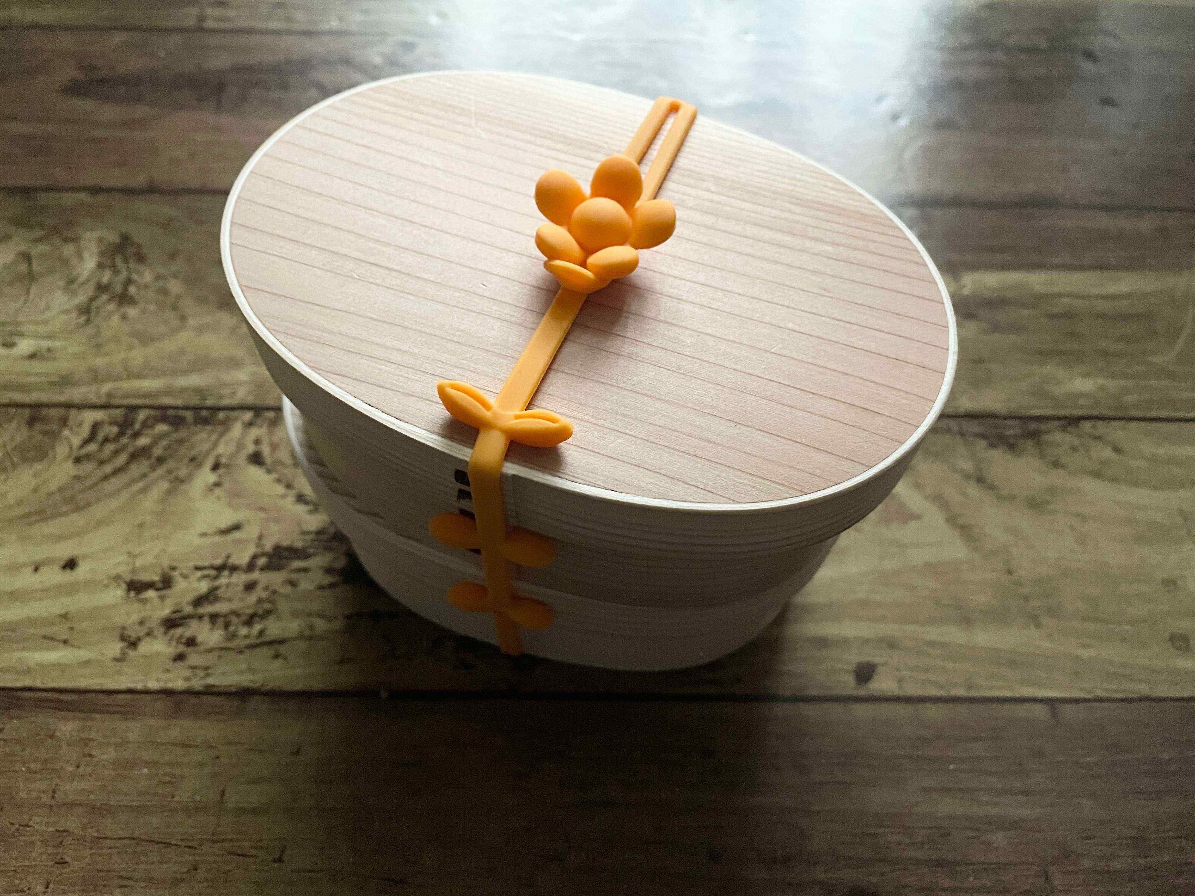 お弁当をランチベルトで留めると、上にお花が咲いたようになってかわいいですよ。
