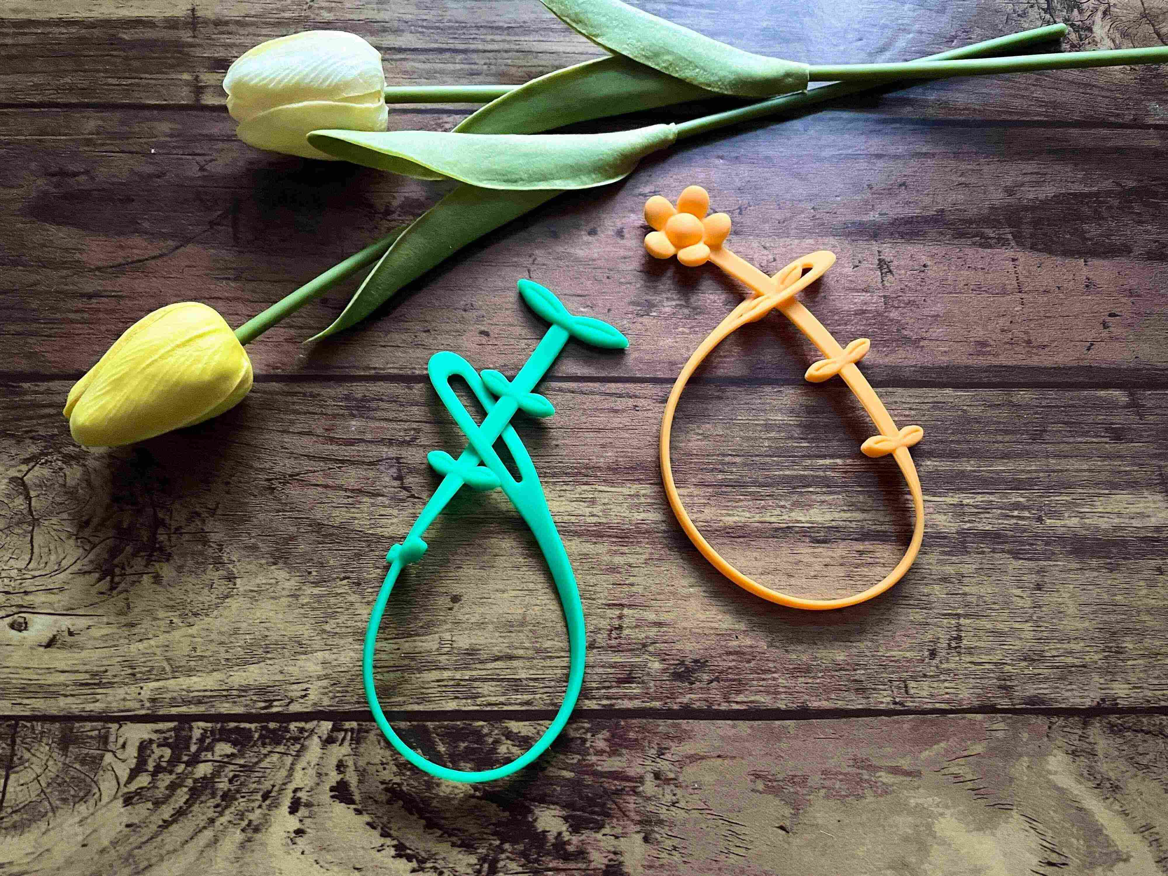輪っかを葉っぱの部分に引っかければ、好きなところで留められます。シリコン製なので、ゴムより伸びにくいのもいいですよね。