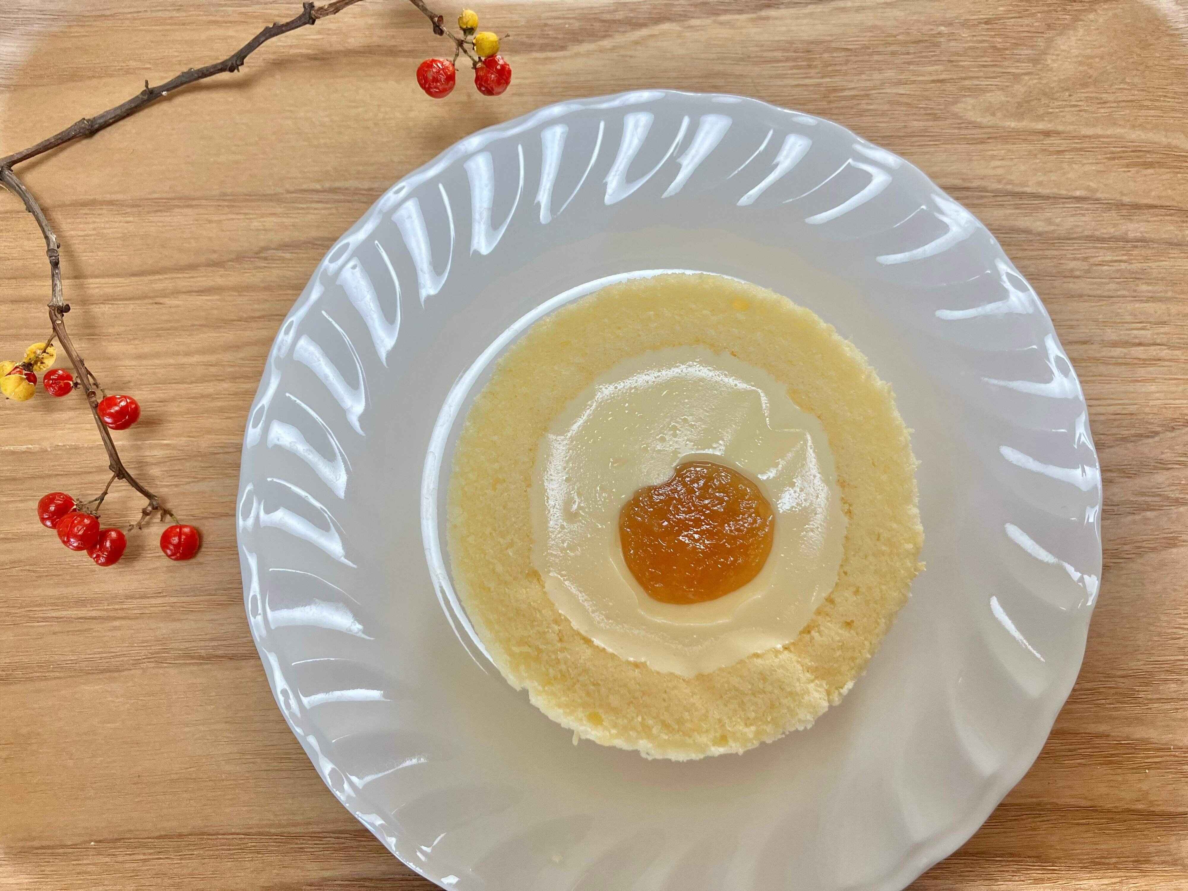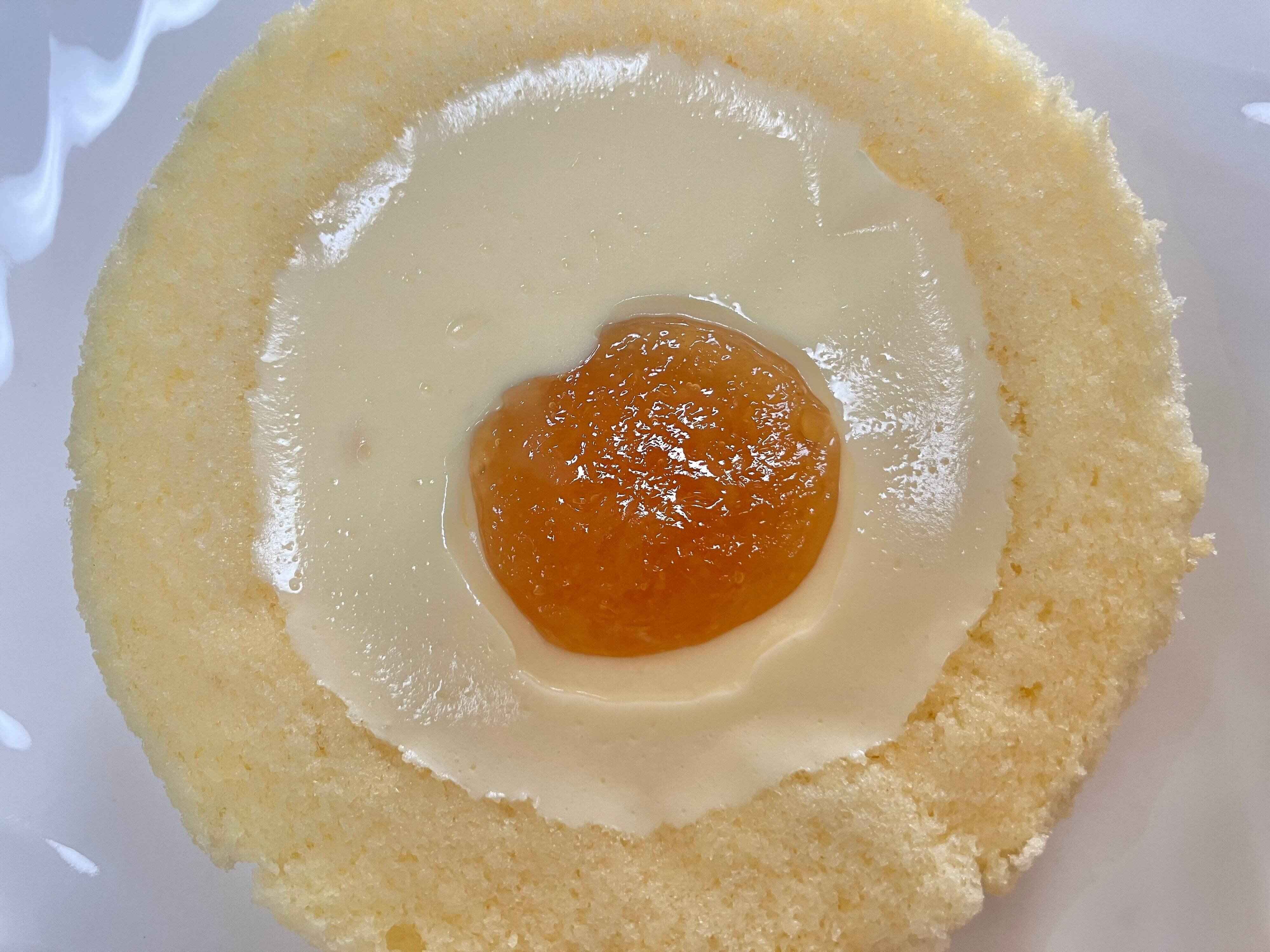 今回のロールケーキはカスタードクリームが使用されているので、通常のプレミアムロールケーキより黄色っぽい色味。中のジャムも艶々としています。