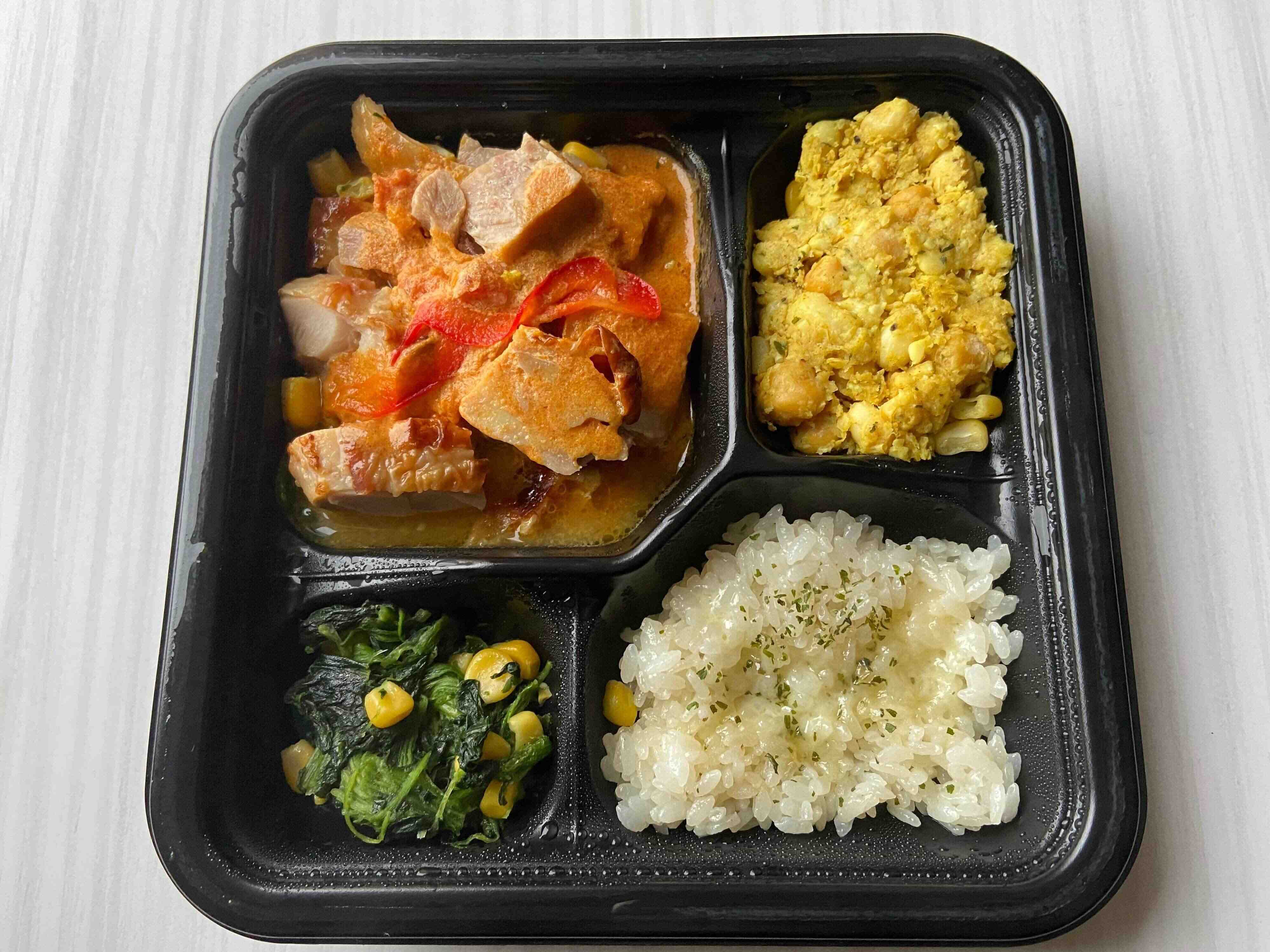 バターチキンカレー風、バターフレーバーライス、豆のスパイス炒め、ほうれん草とコーンのソテーの4種が入っています。鶏もも肉がごろごろと入ったバターチキンカレーが濃厚で本格的な味わい!バターフレーバーライスにはチーズものっていて、カレーとあわせて食べるととってもおいしいです。