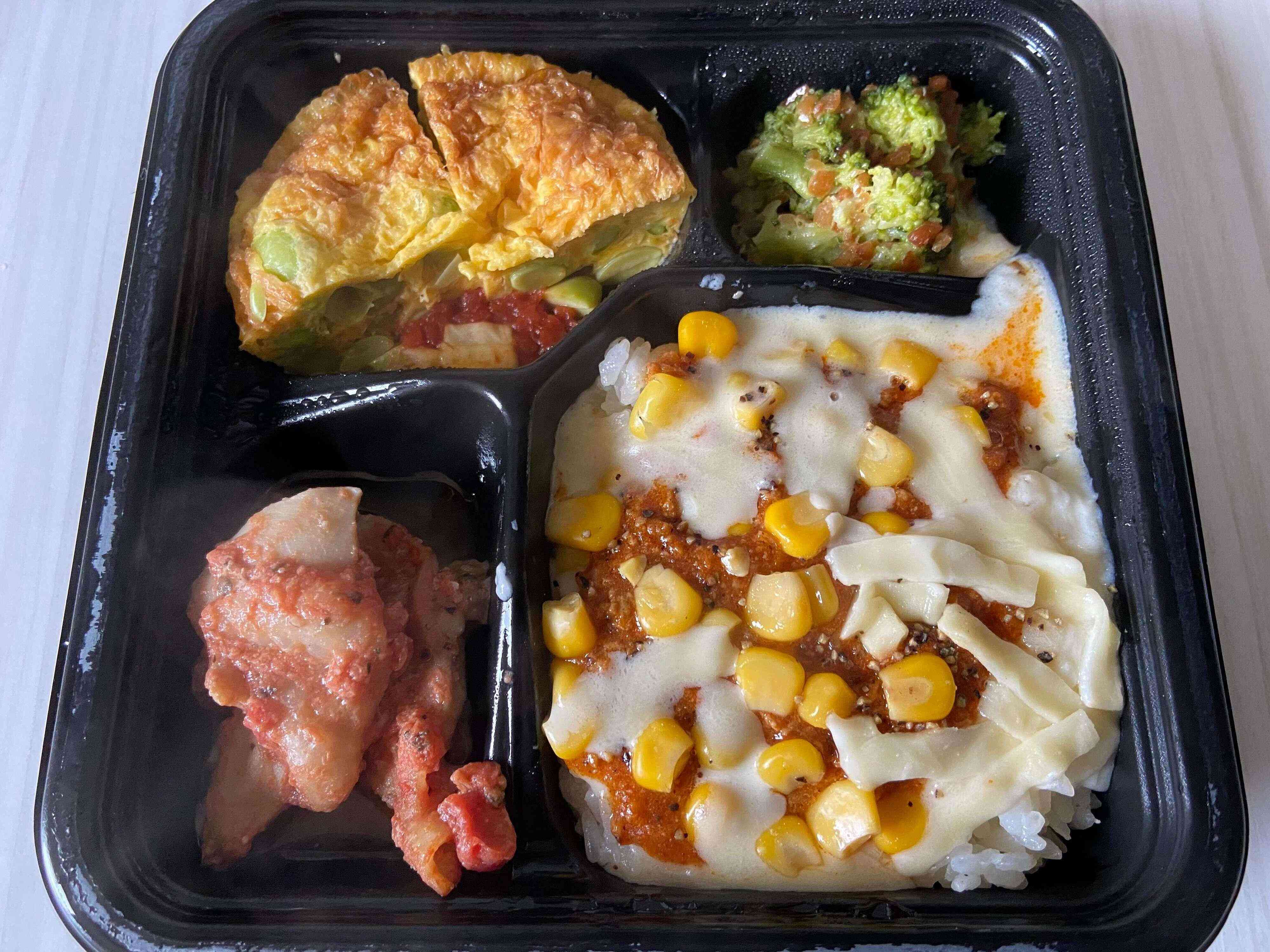 ミートソースにチーズがたっぷりかかったドリアが、コクがあってとってもおいしいです。おかずは枝豆入り玉子焼き、ブロッコリーサラダ、トマトチキンが入ってどれもしっかりとした味つけで食べ応えばっちり。