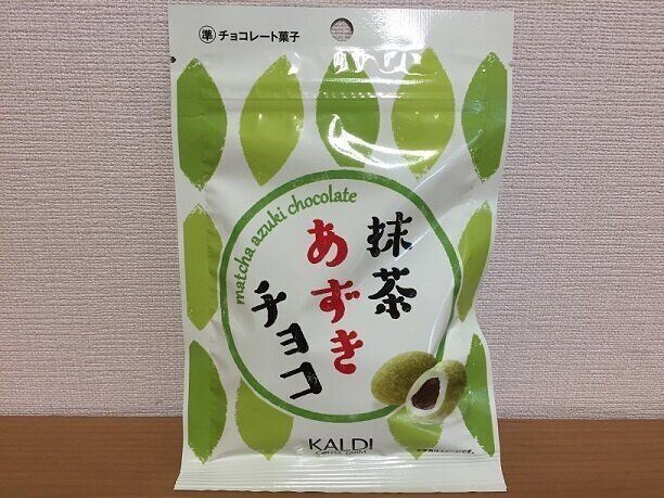 カルディの数あるお菓子のなかでもとくに筆者が大好きなのはこちら、「抹茶あずきチョコ」(購入時:143円)。
