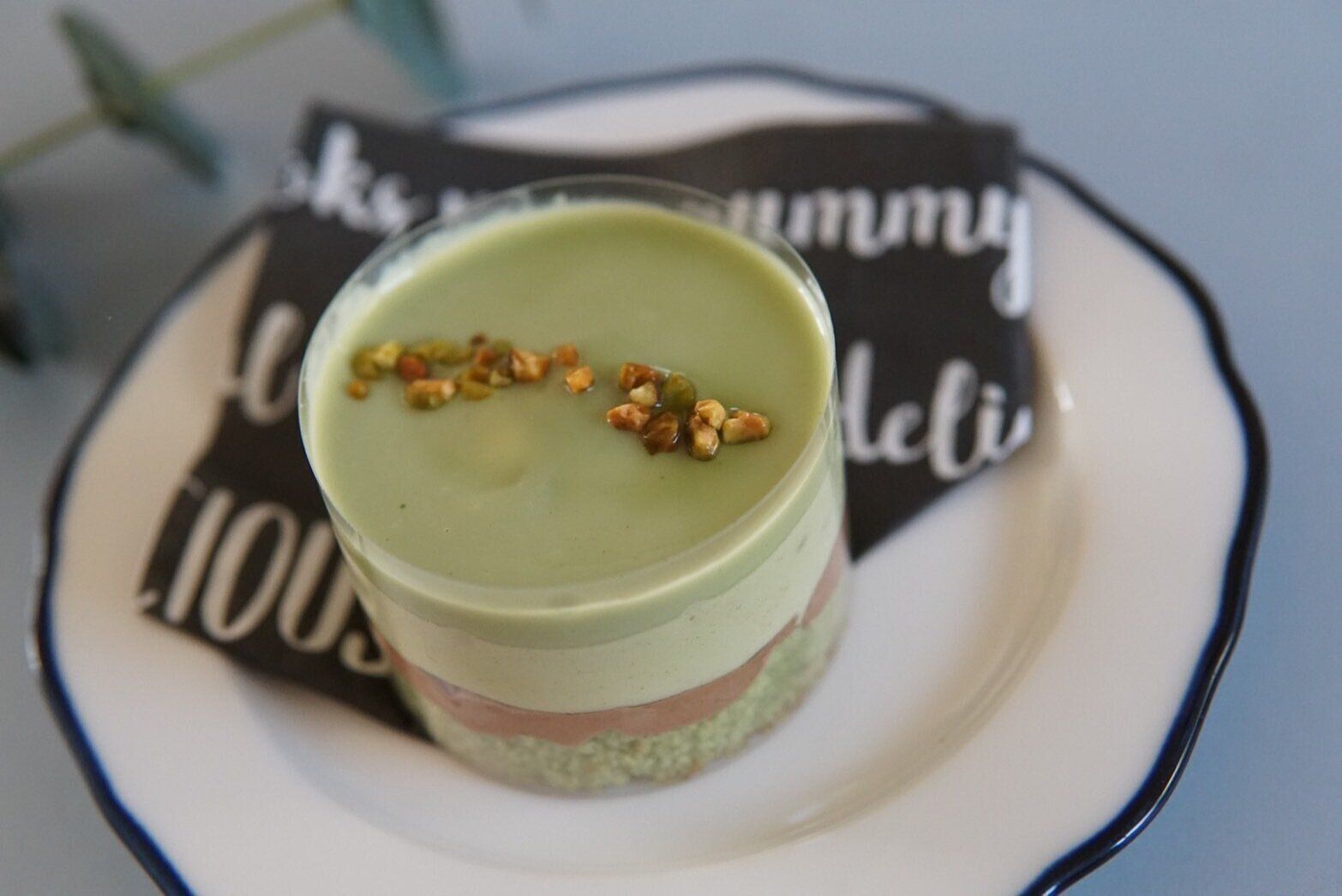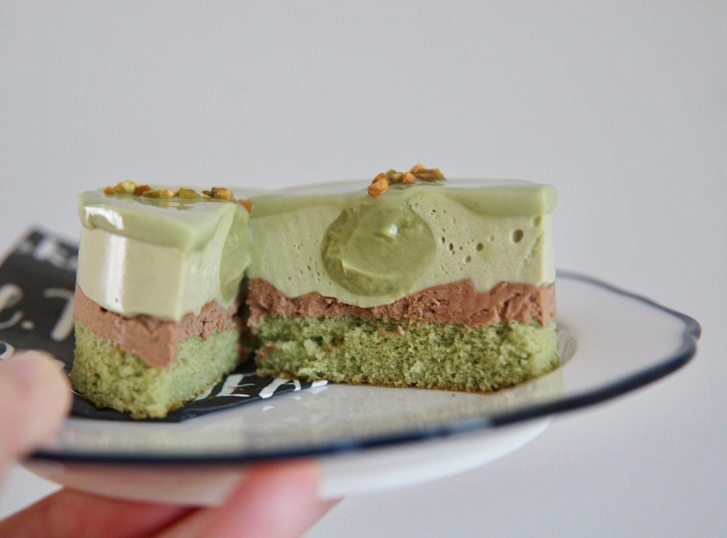 下から、スポンジ・チョコ・ムース・ソース・グラサージュ・トッピング、チョコ層以外の全てにピスタチオが使用されています。
