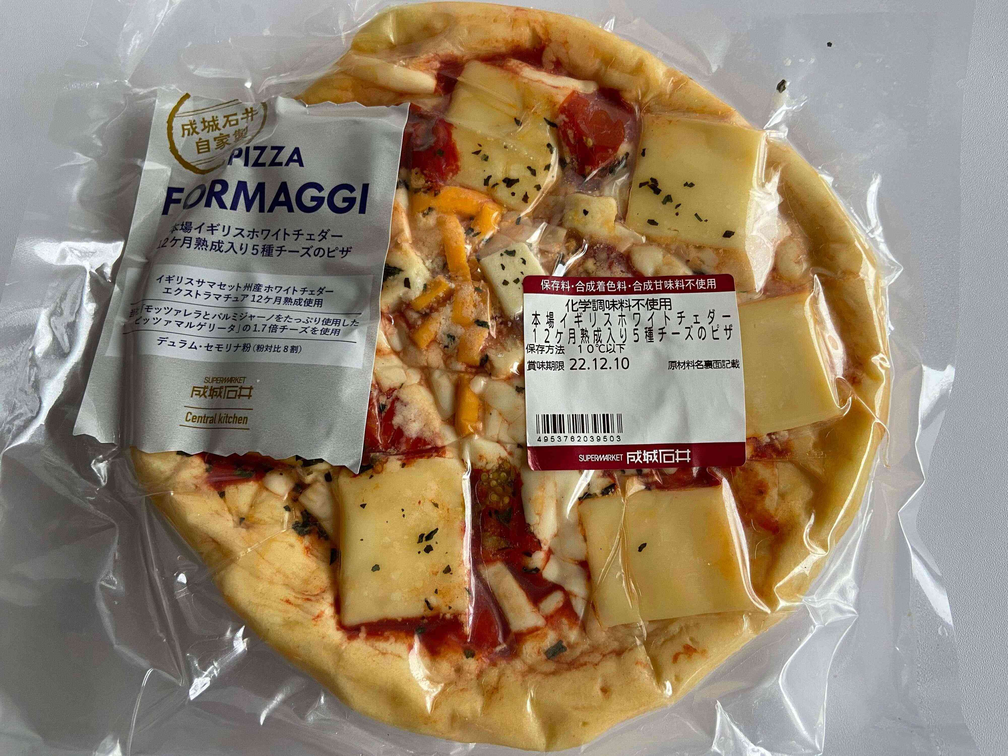 成城石井のセントラルキッチンで製造された自家製のピザで、イギリス産のホワイトチェダー、フランス産ミモレット、モッツァレラ、イタリア産パルミジャーノ・レジャーノ、ステッペンの5種のチーズが使用されています。