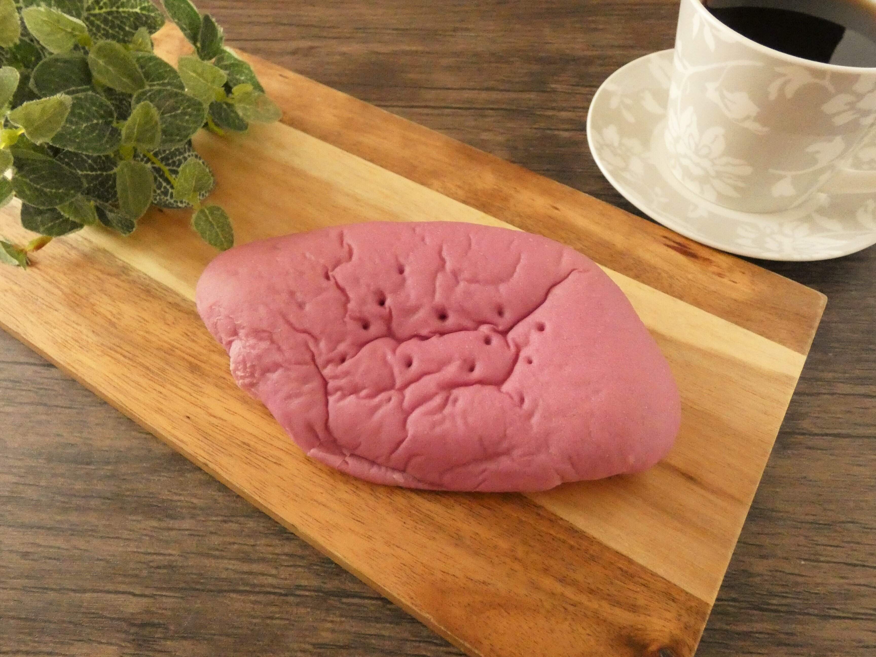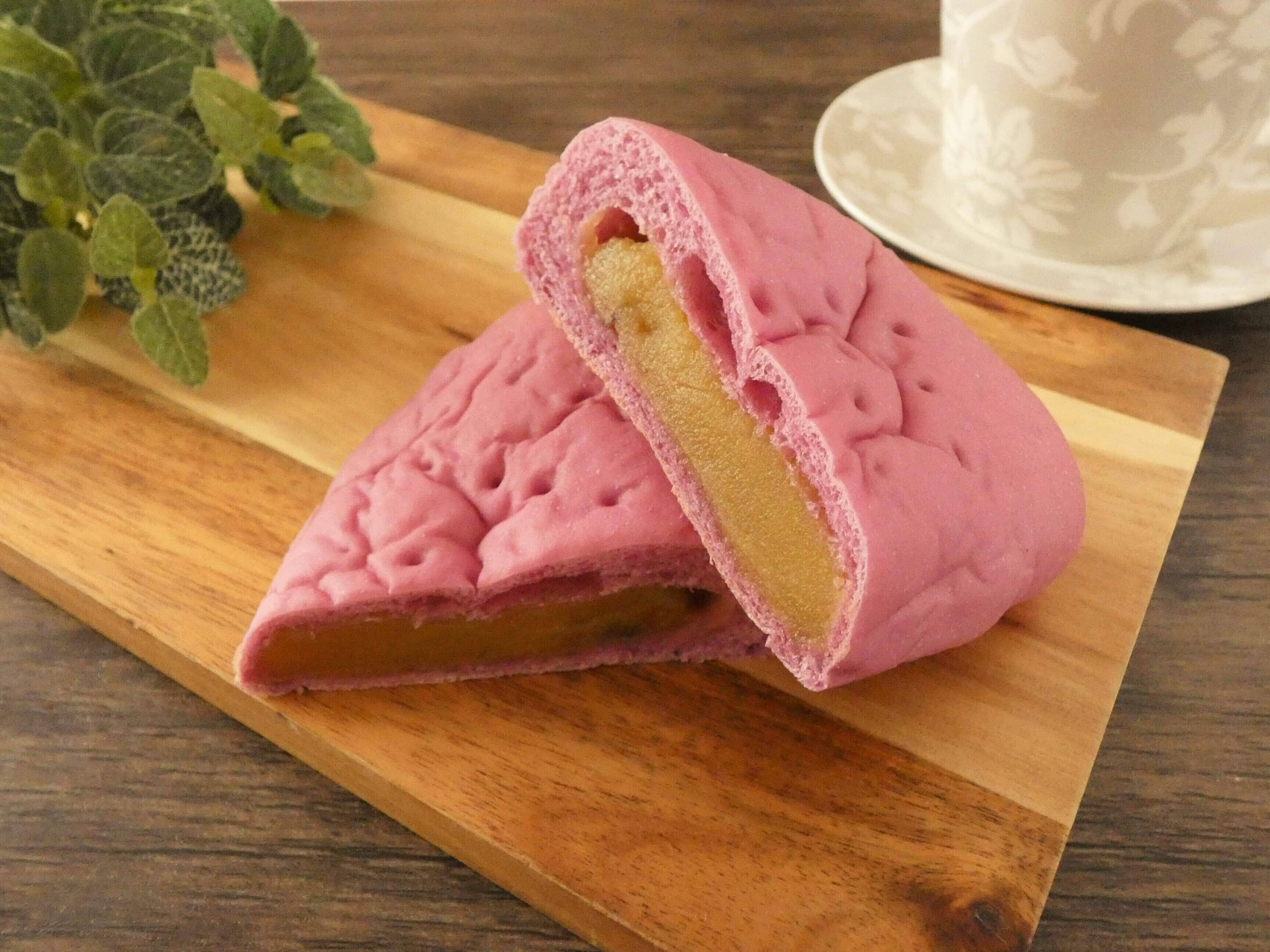 さつまいもパウダーを練り込んだ紫色の生地で、形もさつまいもそのもの。中にはさつまいもあんが入っています。