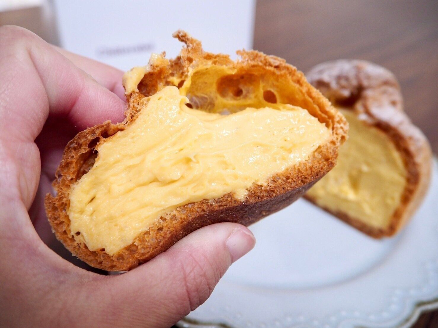バターと卵を強く感じられるこってりとした濃厚なクリームで、シュークリームを逆さまにして持ってもこぼれないほどねっとりと弾力があります。