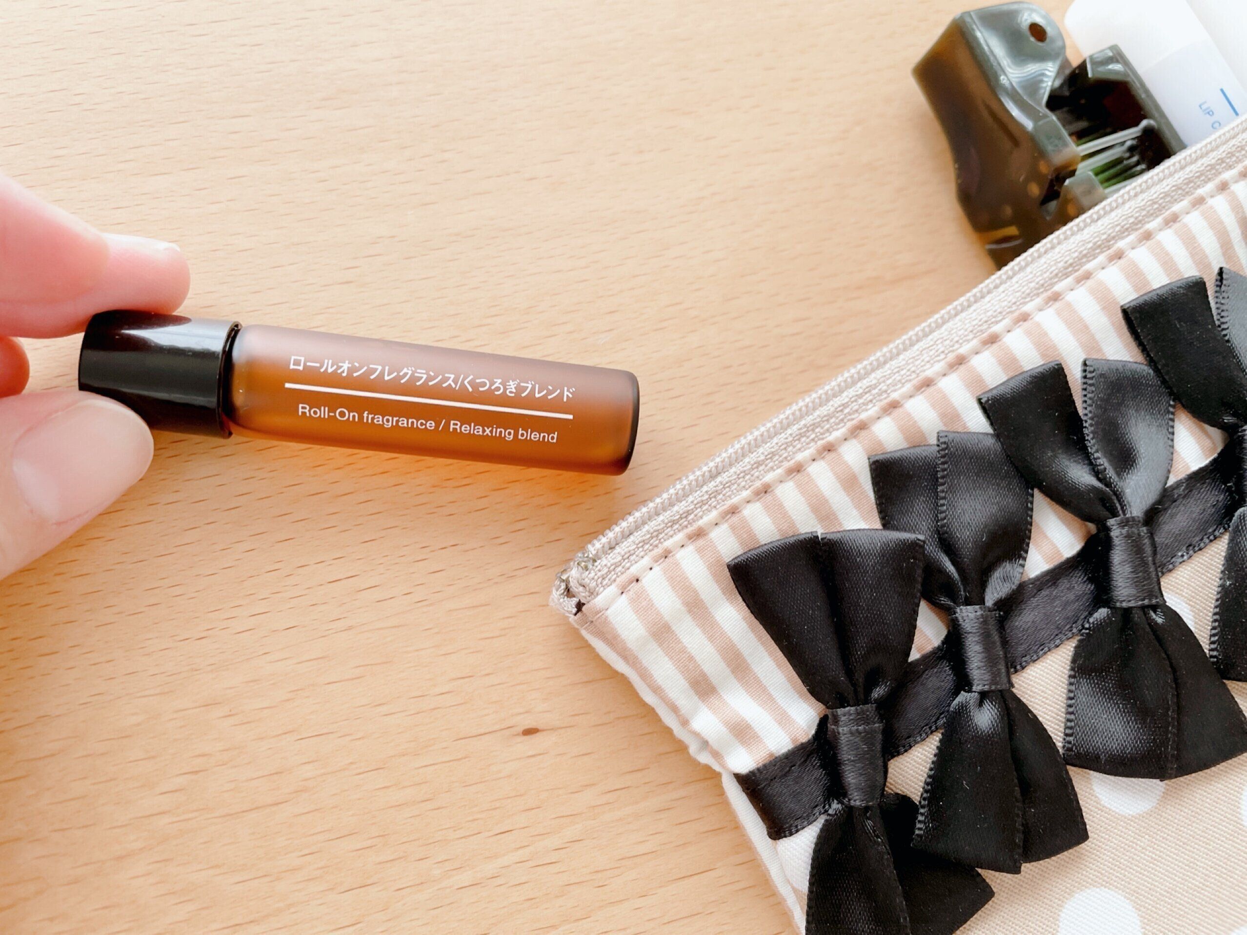会社のポーチに入れていて、朝一会社で身支度を整える時、お昼休憩で仕事に戻る前に、左手首にロールをころころと転がして塗り付けます。右手首と擦り合わせて匂いをまとったら休憩モードから仕事モードに切り替えの合図です。