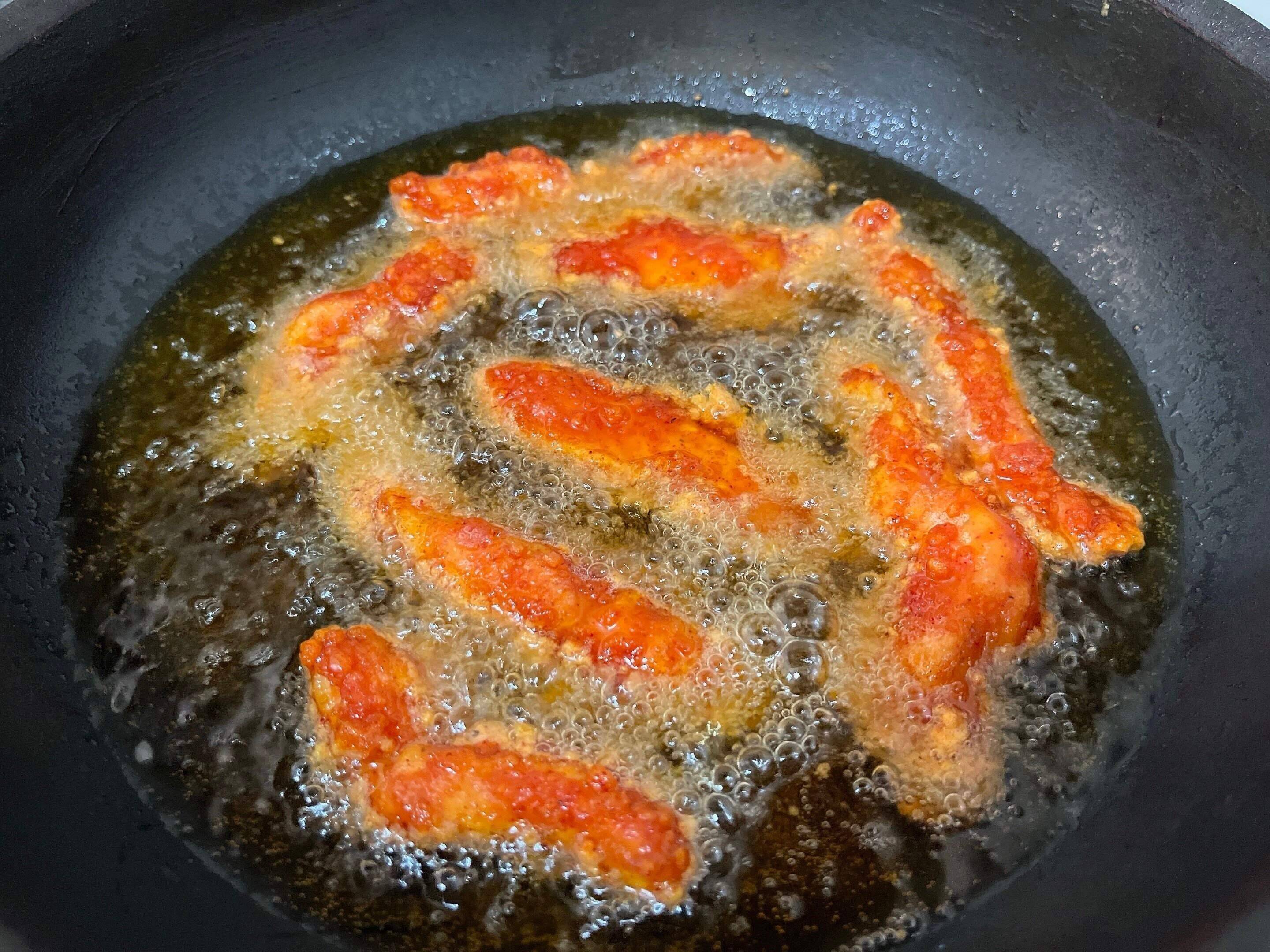 今回は少量の油を使い8個で5、6分揚げました。クリスピーのザクザクな衣がカリっと揚がります。