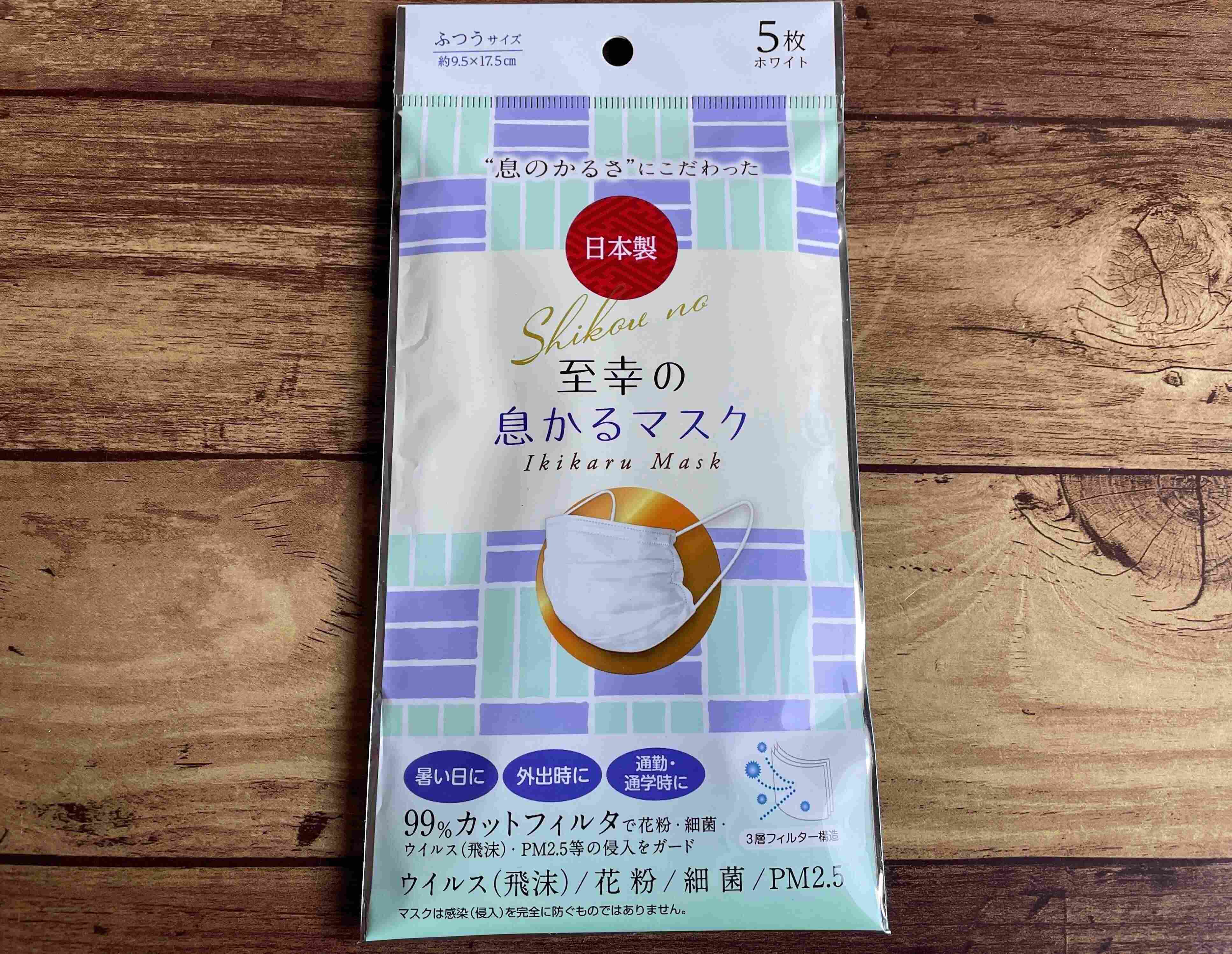 ご紹介するのは、ワッツの「至幸の息かるマスク」です。5枚入りで価格は110円。