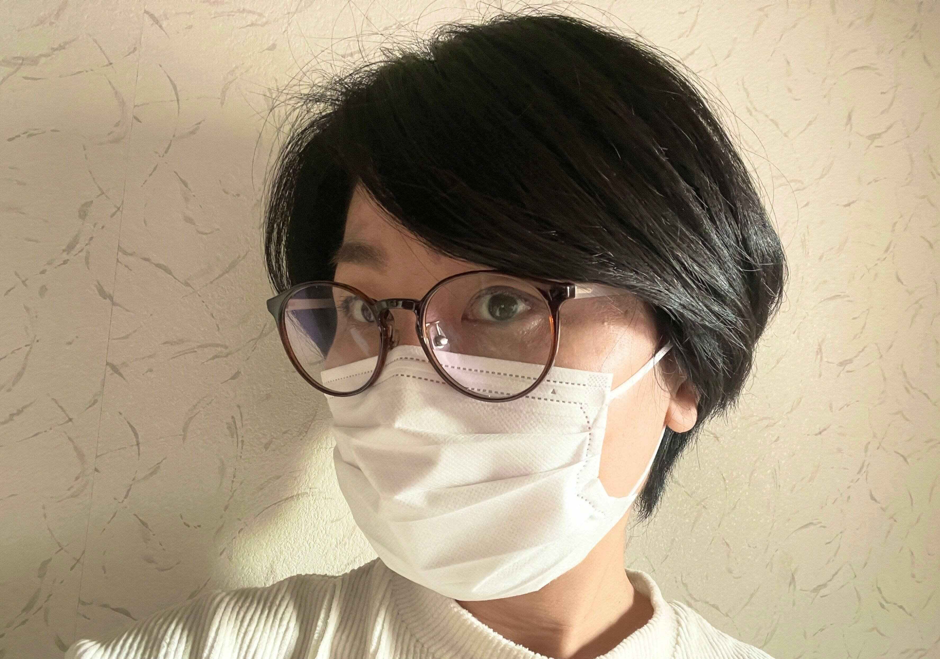 実際に着けてみると、マスクのサイド部分がフェイスラインにピッタリきます。一般的なプリーツマスクよりもスッキリ見えますね。
