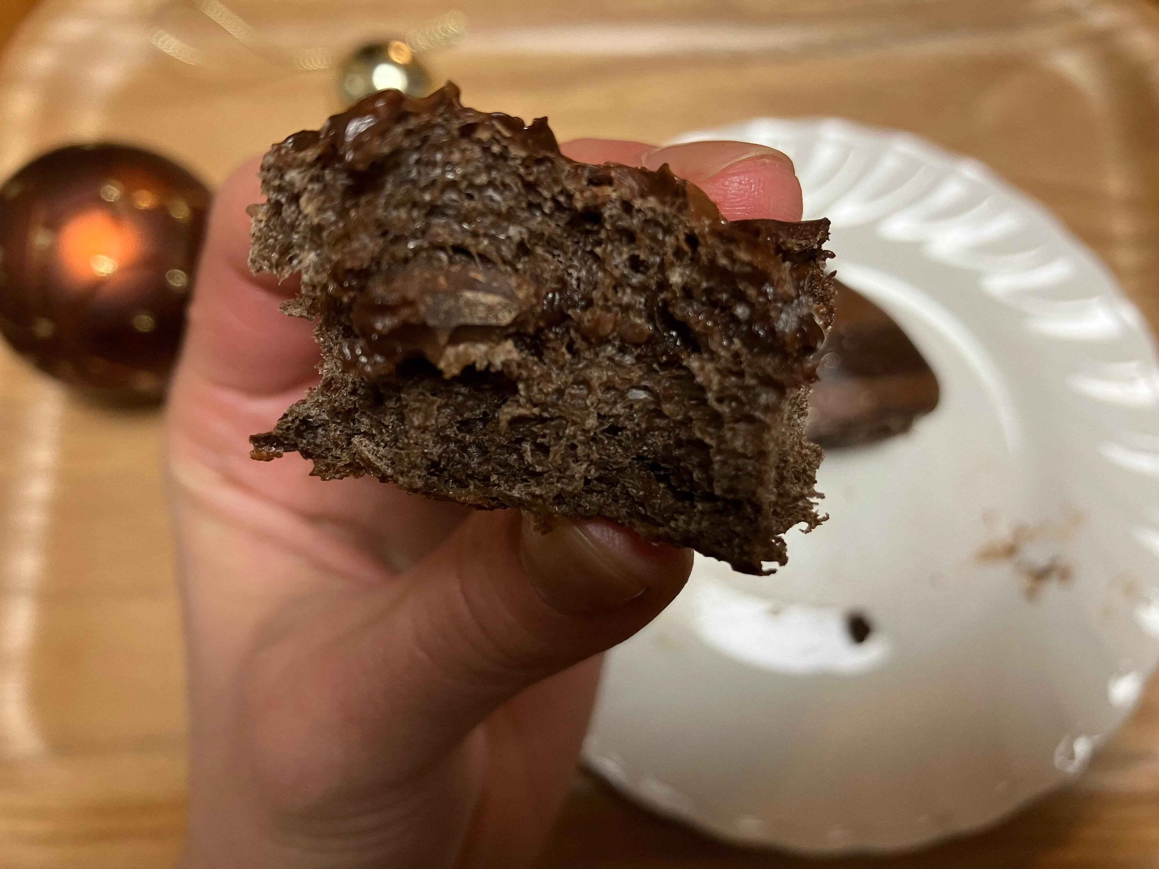 噛むと食感もふわふわとして弾力があります。生地にもチョコが使用されているとのことですが、そこまで甘くありません。