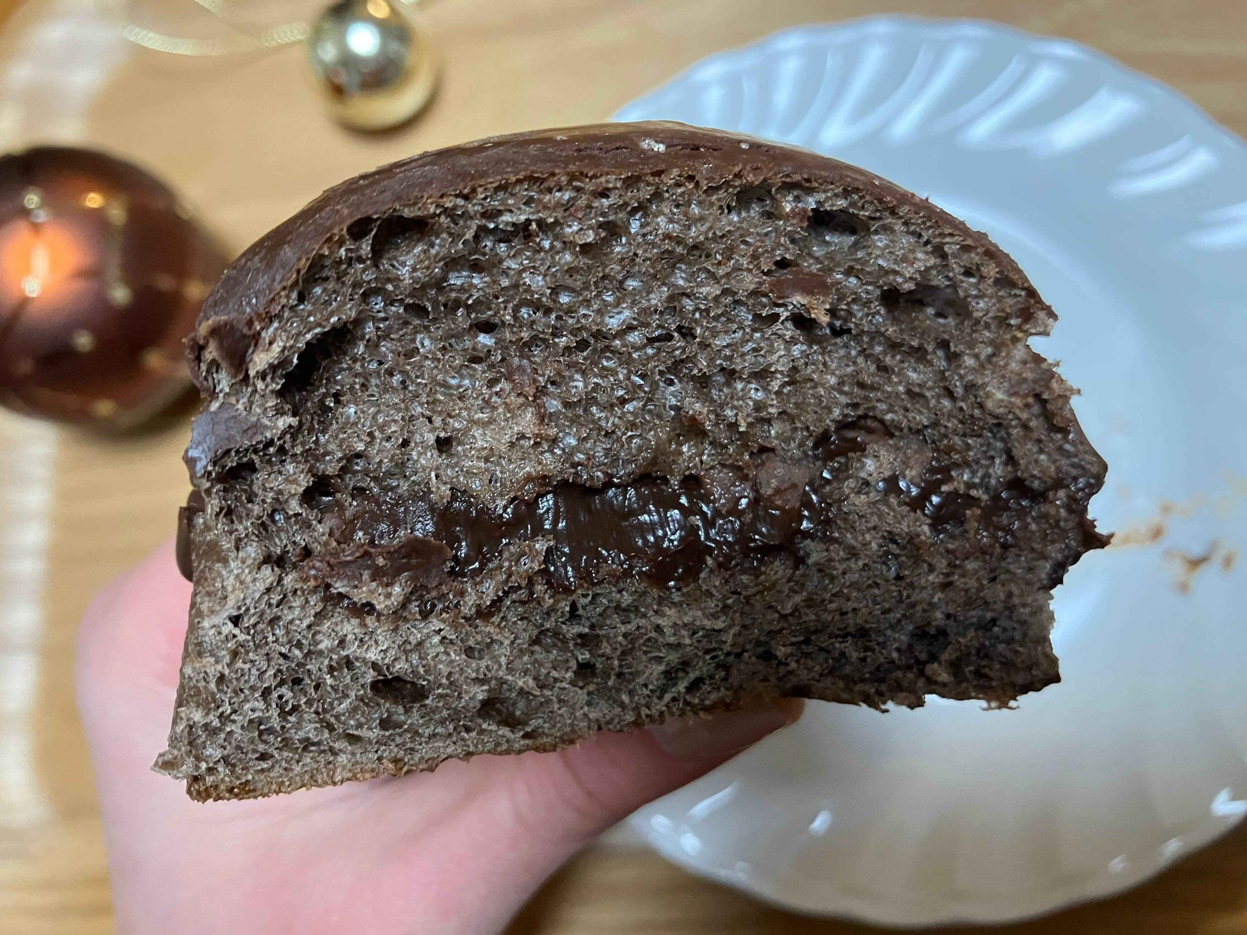 半分に切るととても柔らかい。中からチョコペーストが見えました。パンが結構厚めですね。