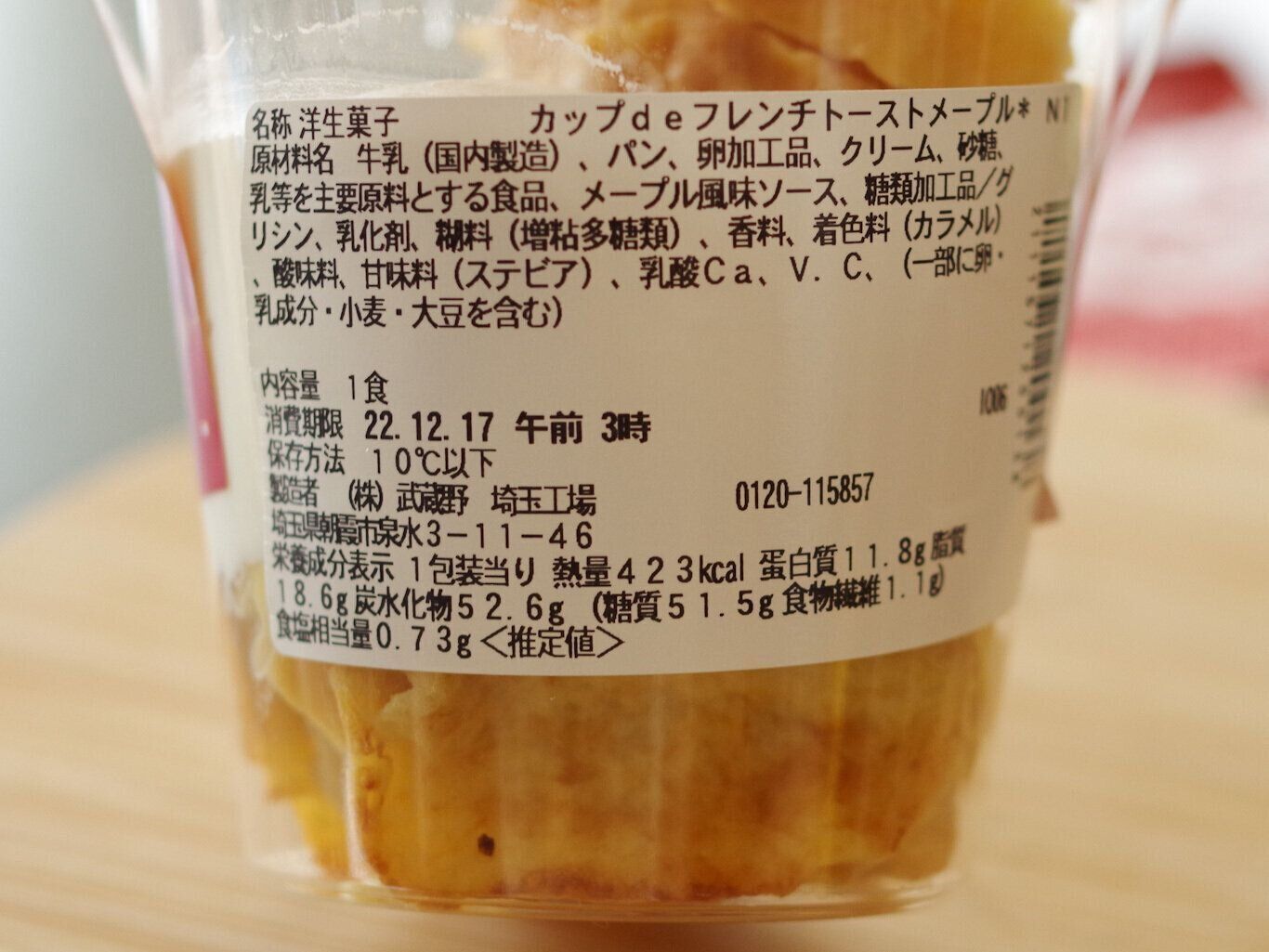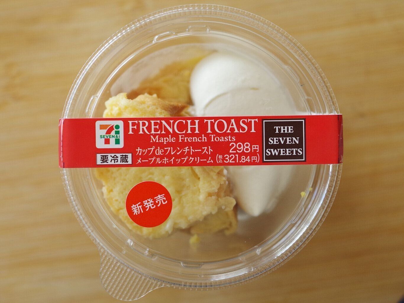 こちらがセブンの新作「カップdeフレンチトースト メープルホイップクリーム」、価格は321.84円です。バゲットを使ったしっとりした食感のフレンチトーストに、メープルフレーバーのホイップクリームを添えたスイーツです。