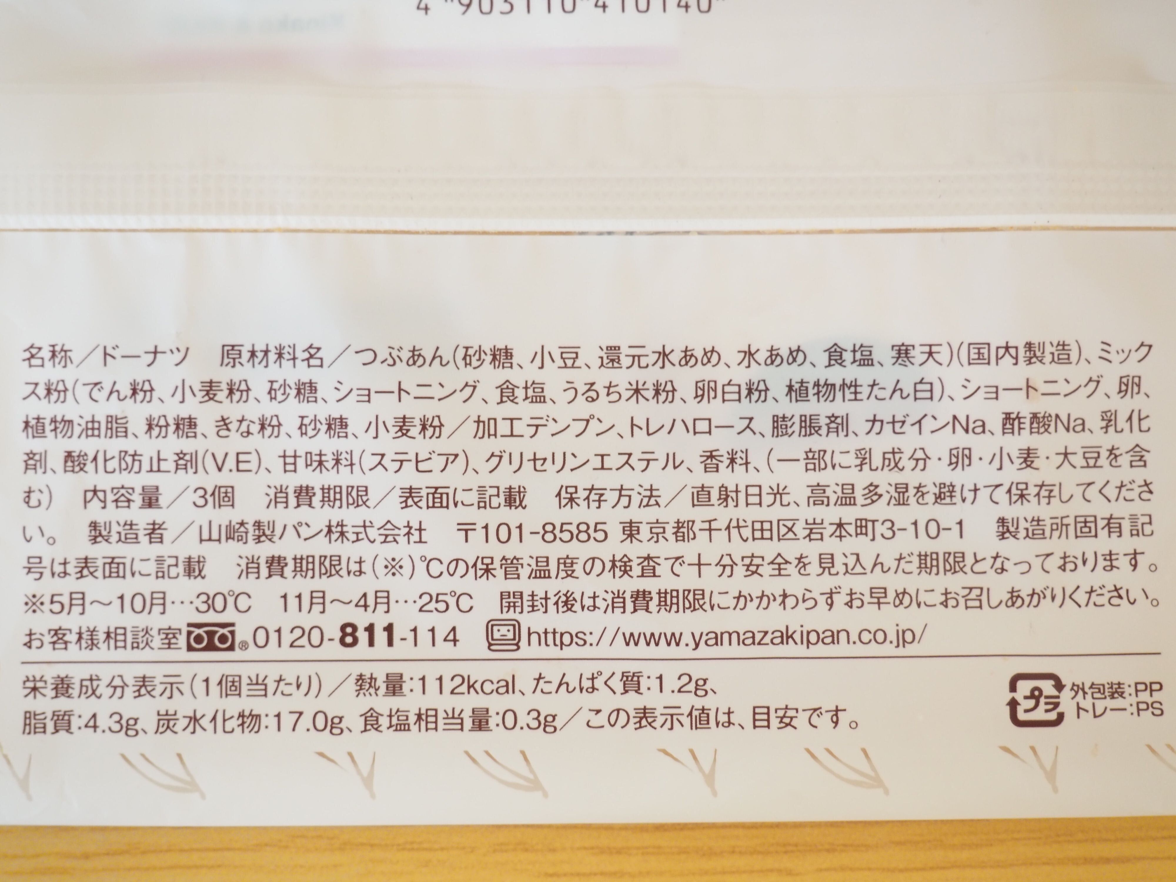 製造を担当するのは山崎製パン。1個当たりのカロリーは112kcalですが、3個入りなので全部で336kcalですね。