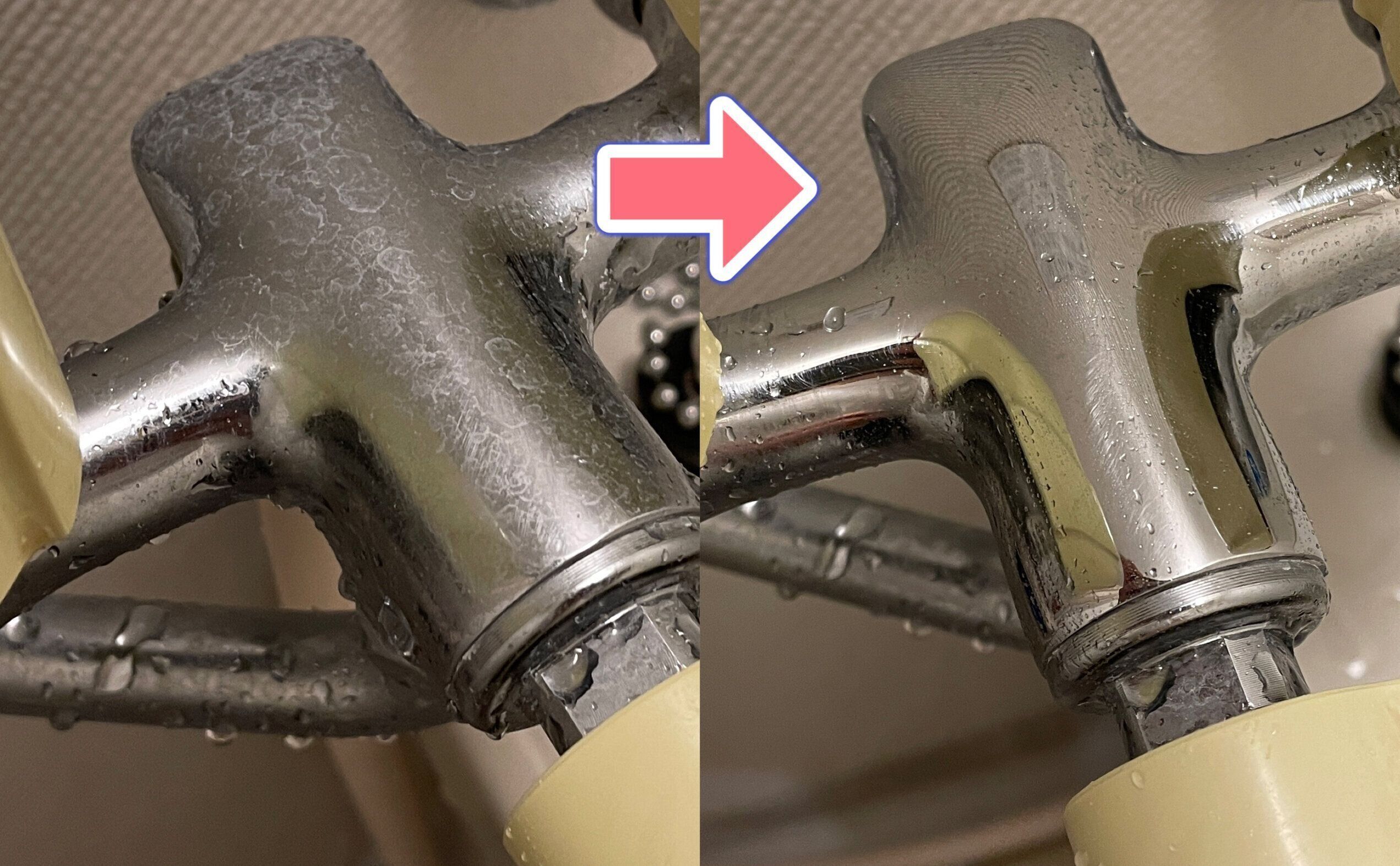 さほど力を入れずに、ひとこすりしただけでも結構水アカが取れました!そこからこまかい部分をシュッシュとしていくと、ほぼキレイな状態に。