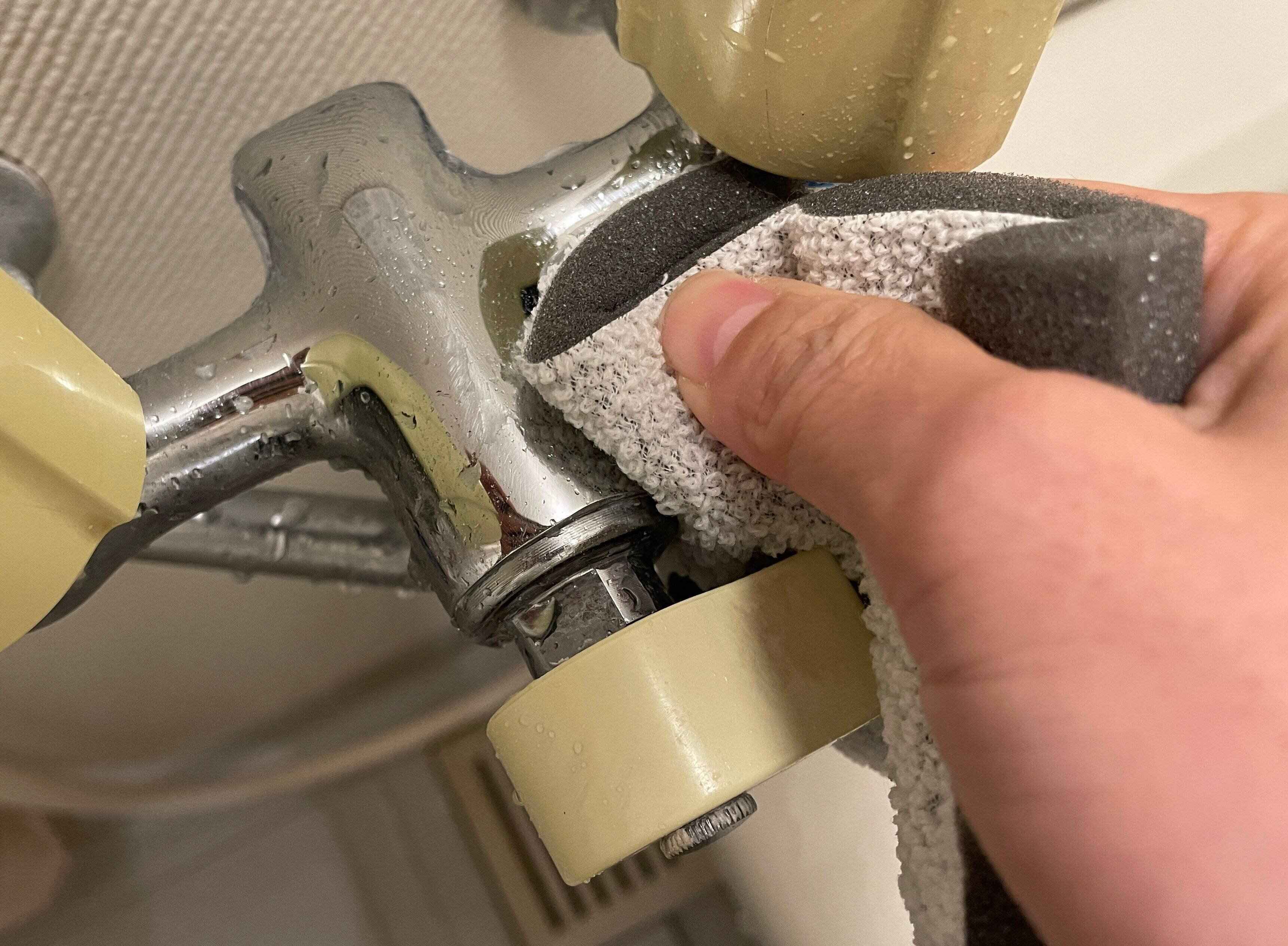 さっそくお風呂の蛇口部分に使ってみました。水だけを付けて、白い水アカ部分をこすっていきます。