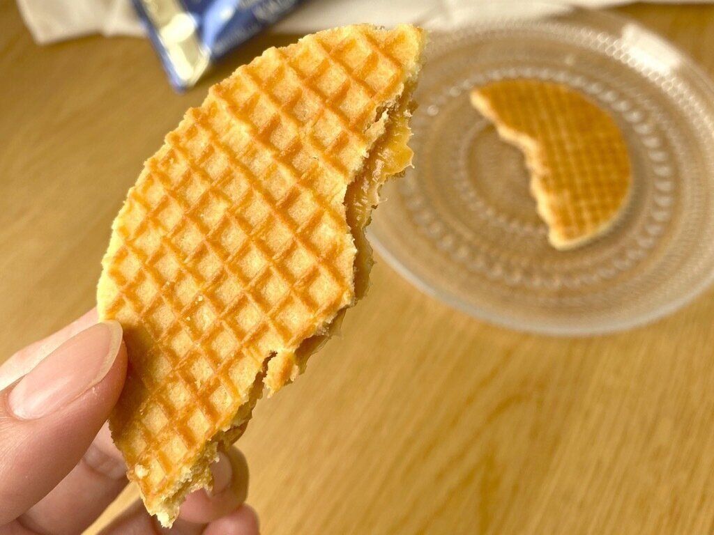 淹れたてのコーヒーや紅茶のカップの上にのせると、サンドされたキャラメルがトロ~っとろけるような食感でおいしいですが、個人的にはそのまま食べるのがオススメ。サックリ、しっとり、ワッフルの絶妙な食感を楽しめます。