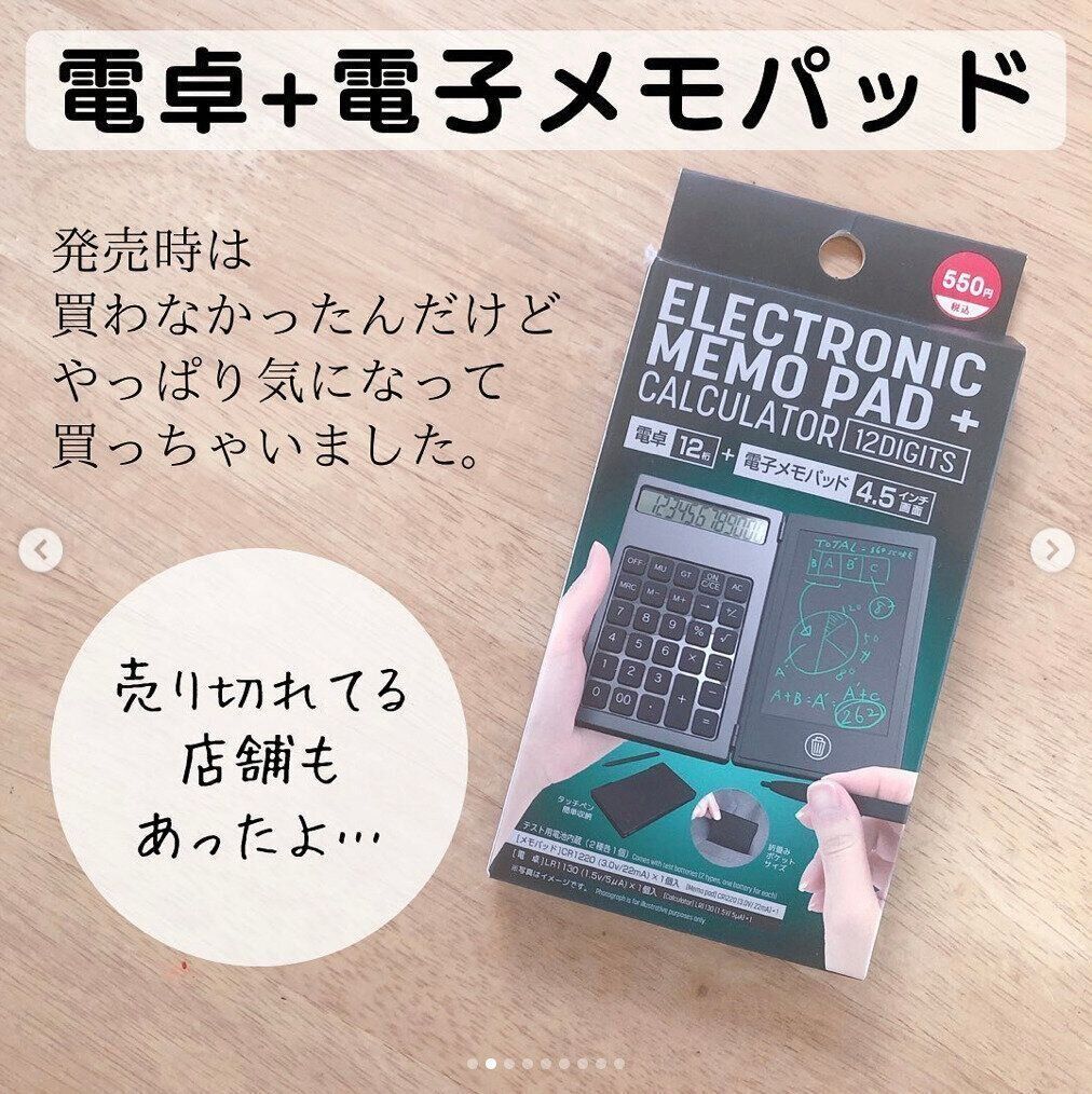 売り切れている店舗もあるという人気商品。12桁の電卓と電子メモパッドがセットになっている商品です。計算して、ちょっとメモしたいときはメモパッドに書いて、ということがこれ1つでできちゃいます。折り畳むとバッグのポケットにすっぽり入るコンパクトサイズなので、ビジネスで使ってもいいですね。