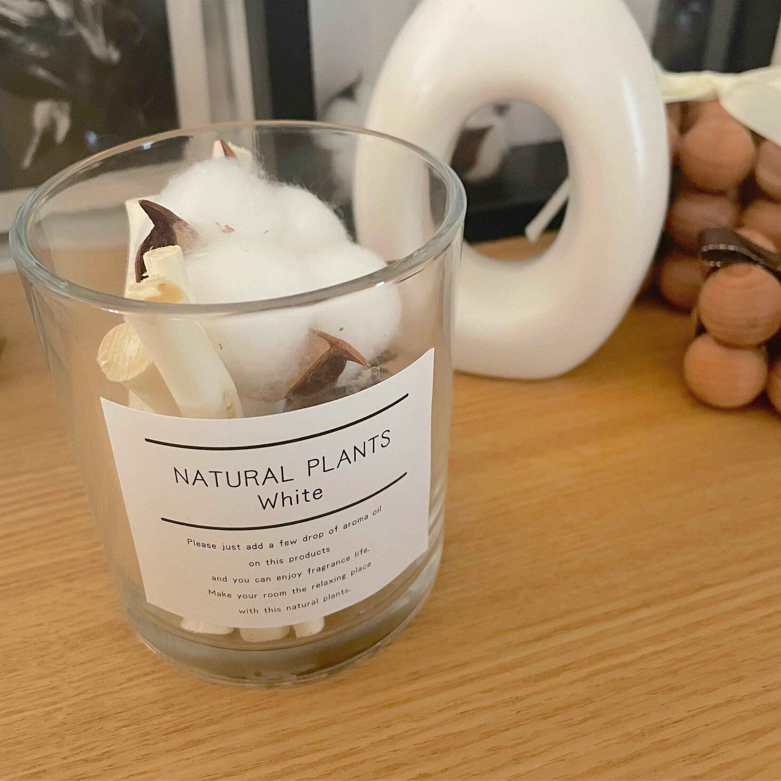 重めのガラス容器に入っているのは白木・コットンプランツ・まつぼっくりです。