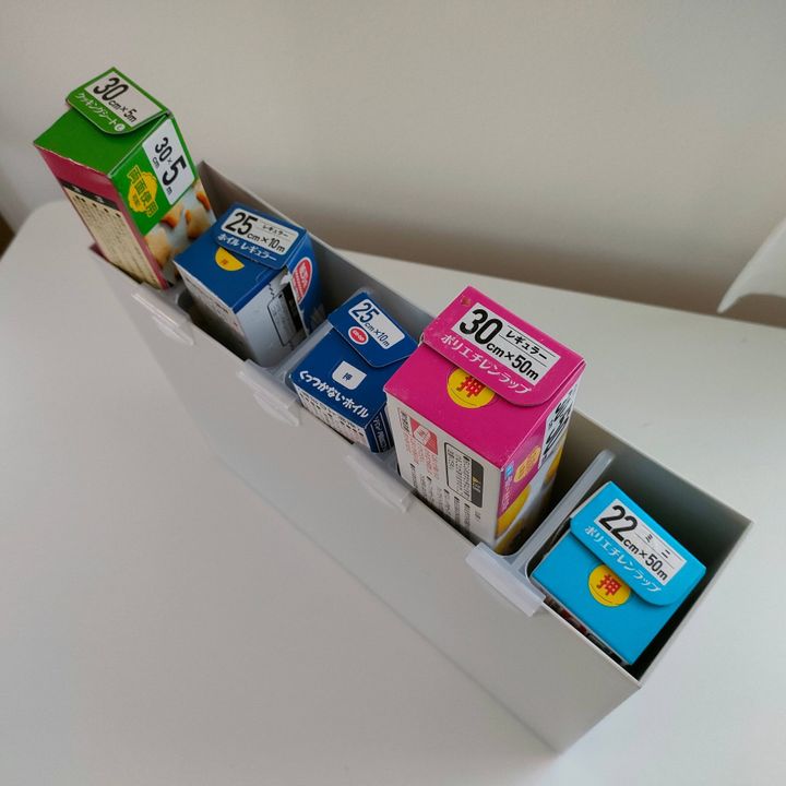 あとはラップ類を収納していけば、あっという間にジャストフィットした立てる収納の完成です。