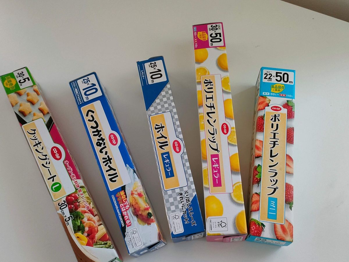 ラップ小、ラップ大、アルミホイル2種、クッキングシートと5つもあることに気が付きました。