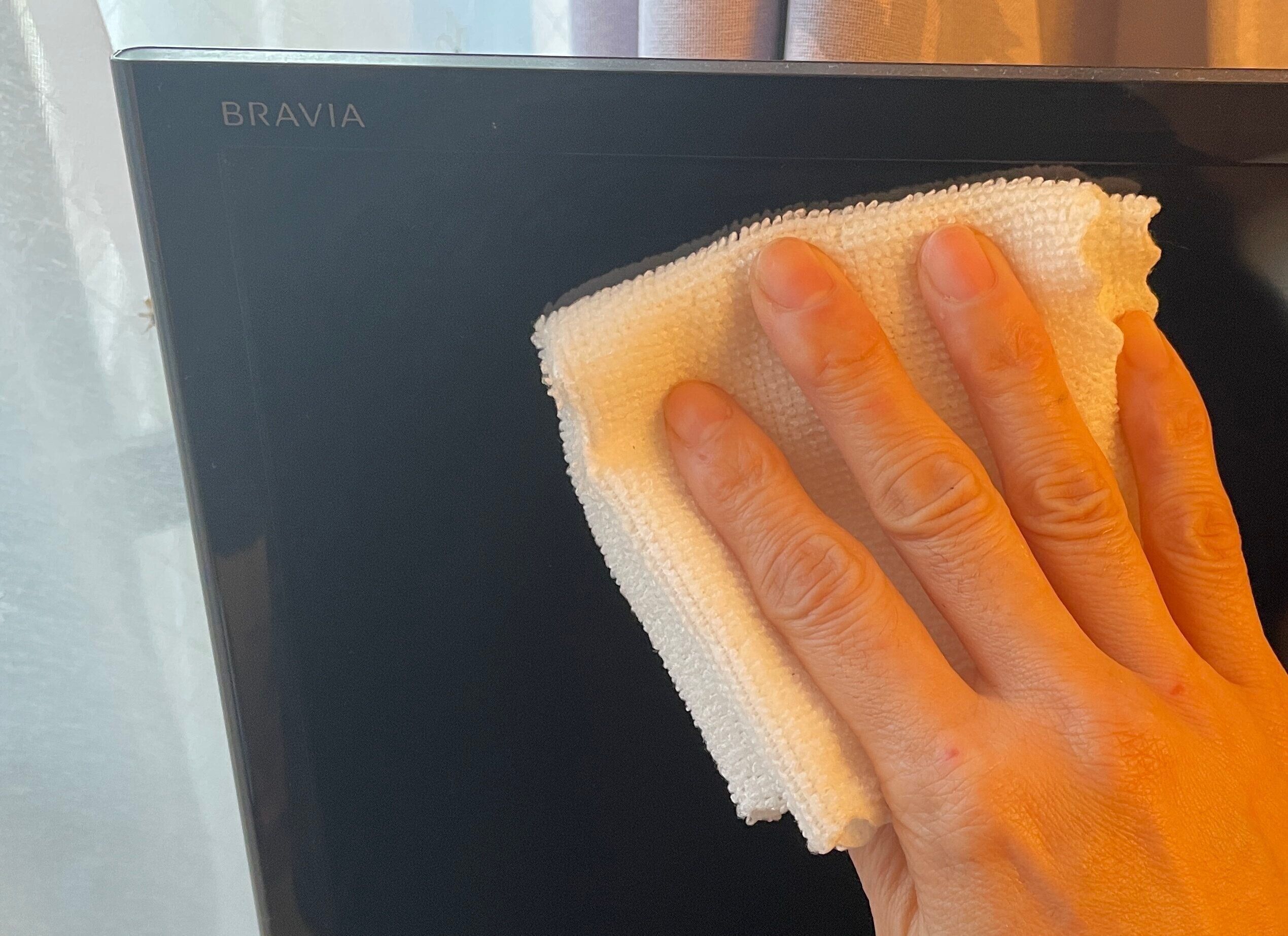 乾拭きで、テレビなどの家電のほこりを取るのにも便利。マイクロファイバーがほこりをからめとってくれますよ。