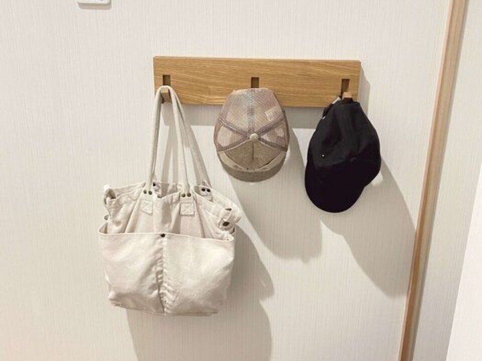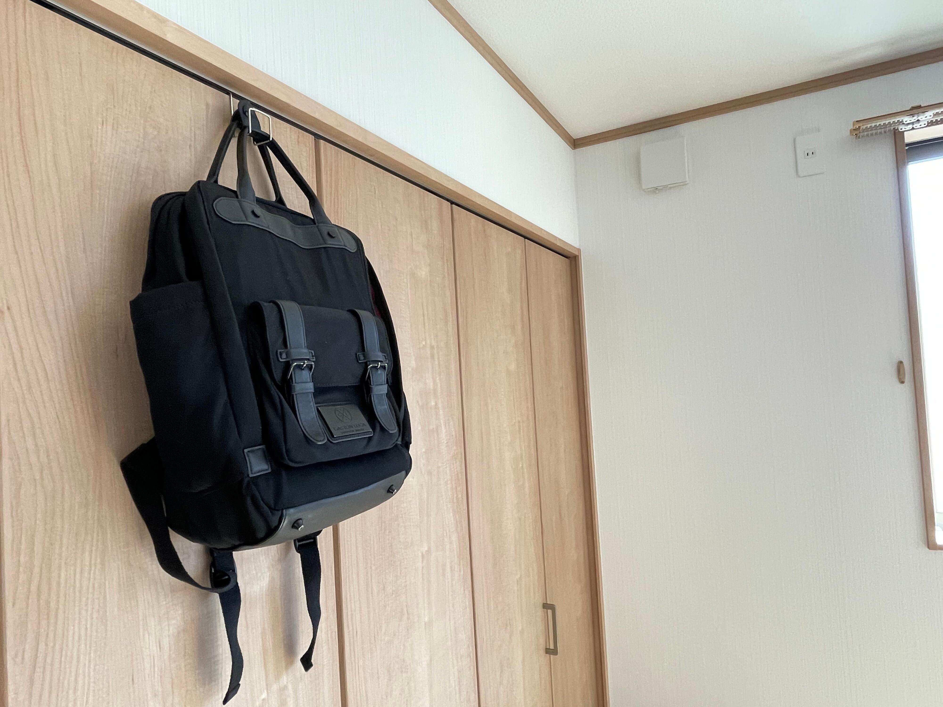 ちょい置きしたいバッグなどは、クローゼットのドアを利用して「ステンレス扉につけるフック」を設置しています。折れ戸でもまったく問題なく使えています。